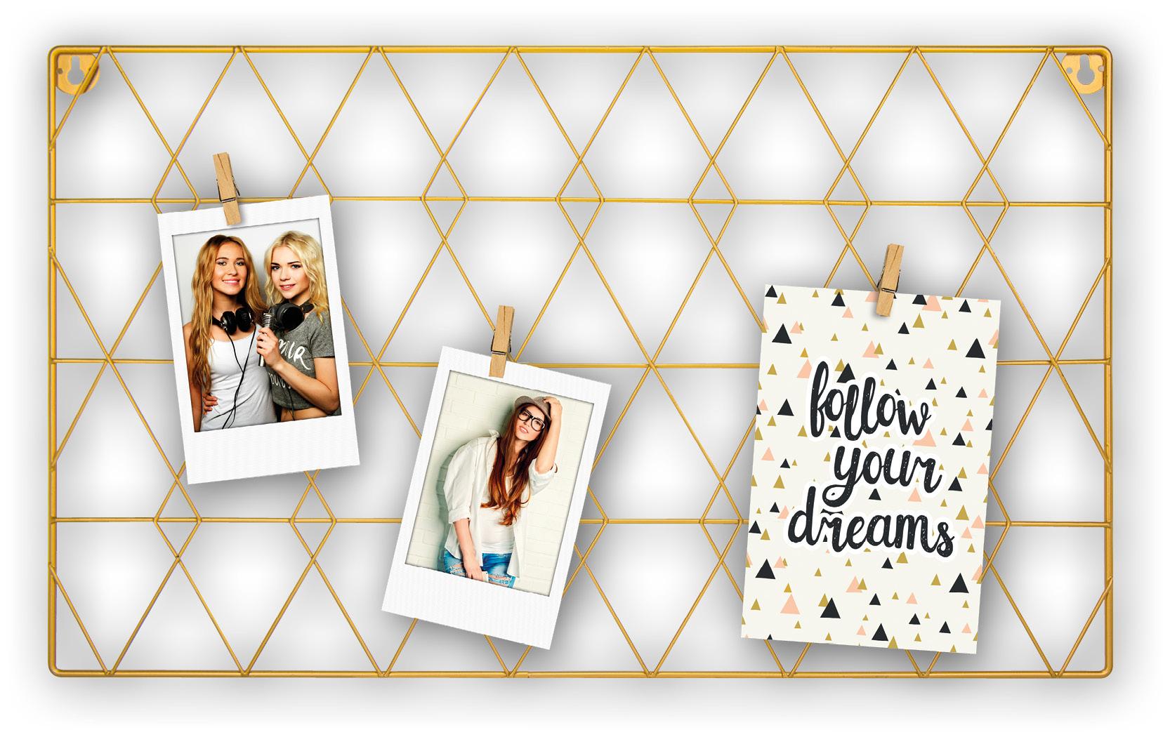 Faliújságként tervezett kollázskeret, ahol a fotókat csipeszekkel rögzítheted. A keret fémből készült, aranyszínű árnyalatban. Mivel magad rögzíted a képeket, választhatsz különböző méretű fotókat, és kiélheted a kreativitásodat, például kisebb posztereket vagy szép papírokat rögzíthetsz! A keret külső mérete 50x30 cm. Ez a keret különösen jól mutat az íróasztal fölött, a konyhában, vagy bárhol máshol, ahol dekoratív és funkcionális szerepet tölthet be. Fali rögzítés tartozék.