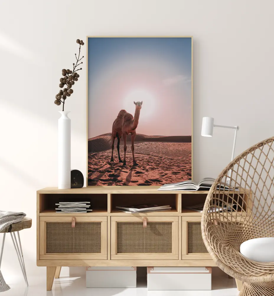 Egy vadon poszter egy tevével, amely a sivatagban áll. A teve előre néz a puha homokban. A nap mögötte van, és drámai halót hoz létre a teve feje mögött, ami még jobban kiemeli az állatot. Egy világoskék égbolt kontrasztot alkot a homokkal egy egyedi teveportréért.