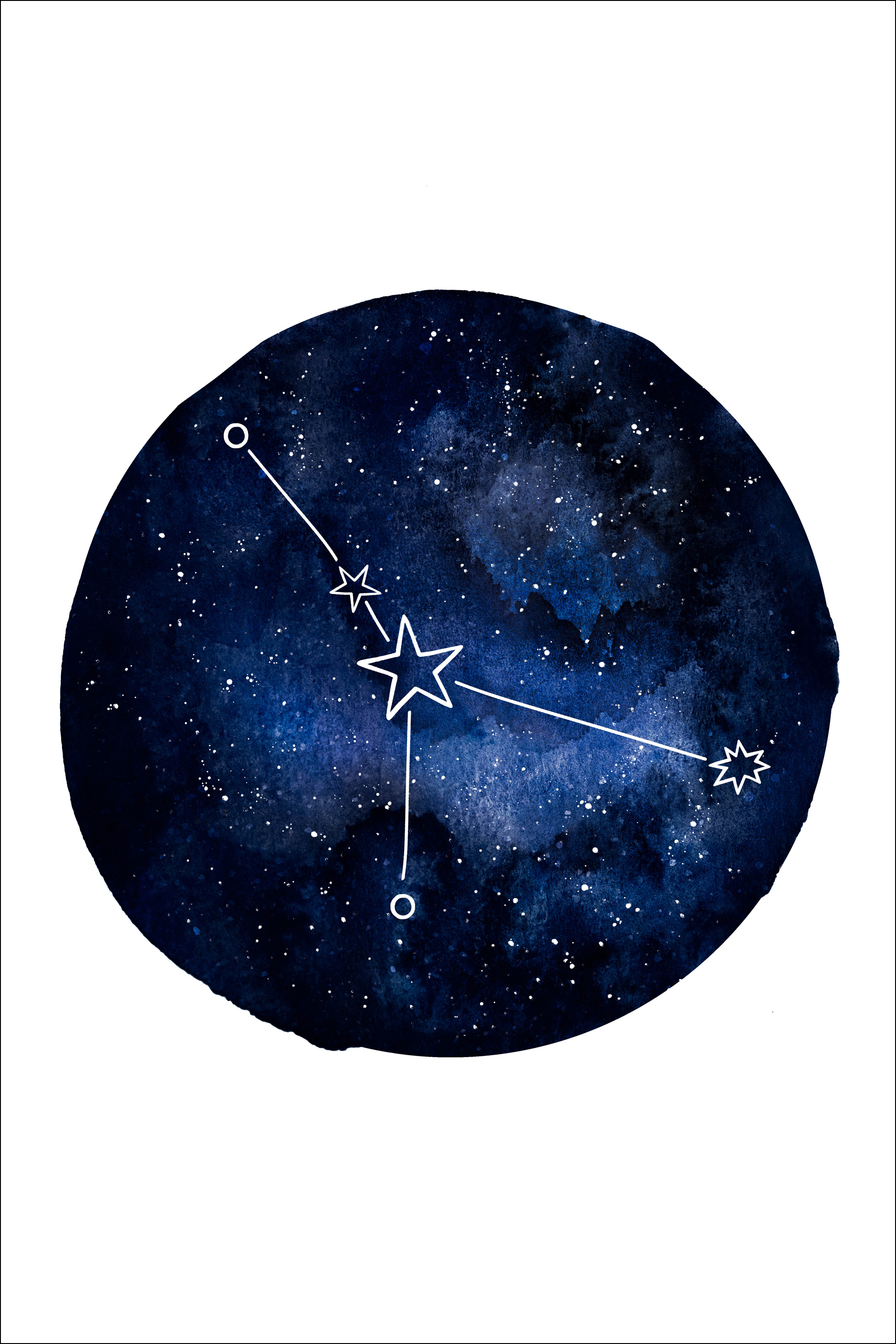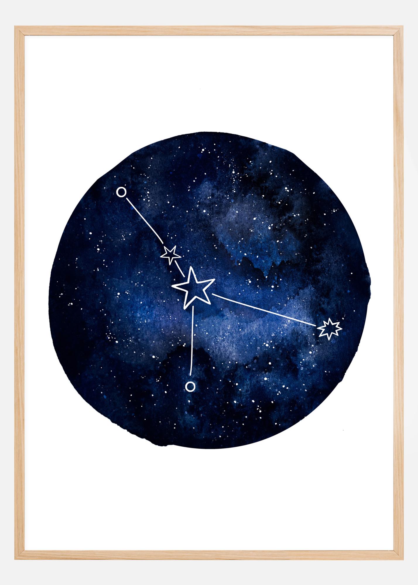 Egy horoszkóp poszter a Rákkal. Egy sötétkék kör tölti ki ennek a fehér képnek a közepét. A körben különböző kék árnyalatok, valamint különféle csillagok láthatók. A Rák csillagjegye kiemelkedően jelenik meg a központban. Ha szereted a csillagjegyed, ez a kép kötelező a faladon.