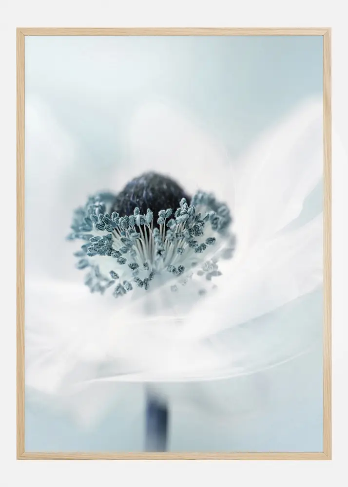Egy közeli poszter egy csodálatos fehér virággal. A virág kék közepe van fókuszban. A fehér szirom nagyon vékony és varázslatos érzést kelt a lágy kék háttér előtt. Érezd a fantáziát ebben az érzékeny fotóban.