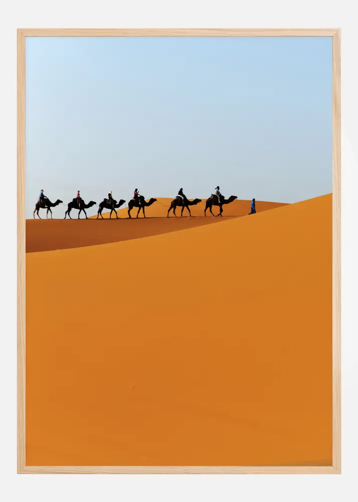Egy stilizált poszter egy tevekaravánnal, amely áthalad a sivatagon. Nagy, merész narancssárga szakaszok vonzzák a tekintetet a sivatagot átszelő hat teve és lovasaik sziluettvonalára. Élvezze a színeket, ahol egy narancssárga sivatag és egy kék ég találkozik kiegészítő színekkel.