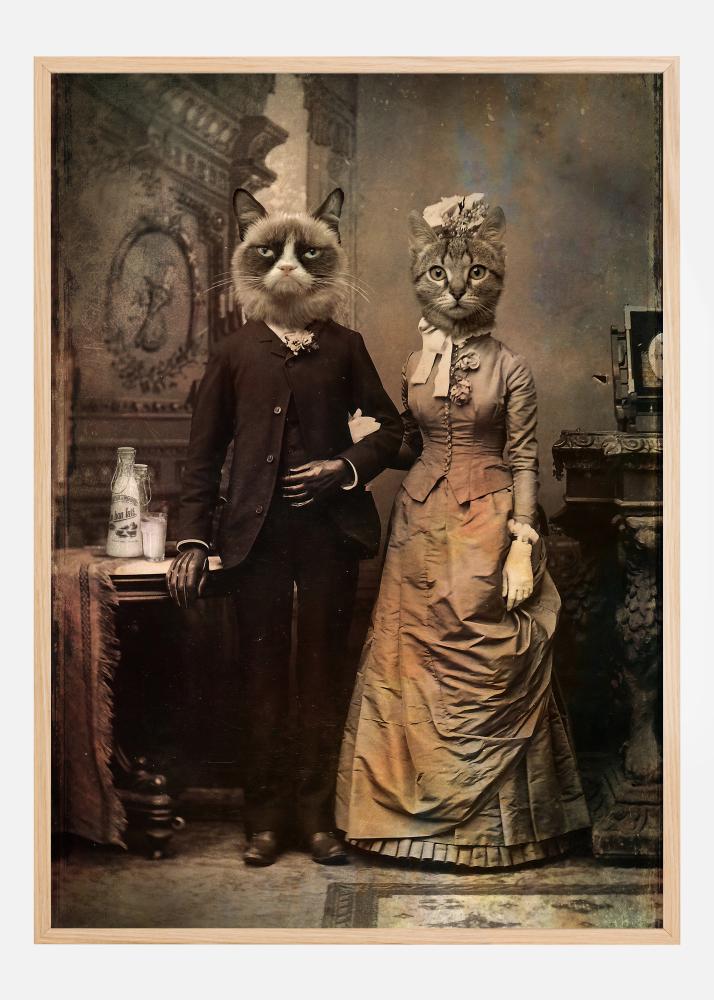 Egy komikus poszter, amely egy macskapárt ábrázol viktoriánus ruhákban. A mogorva macska és menyasszonya teljes viktoriánus divatban, öltönnyel és fűzővel jelennek meg ezen a szépia nyomatban. Vigyél egy kis nevetést az otthonodba ezzel a képpel a nappalid falán.