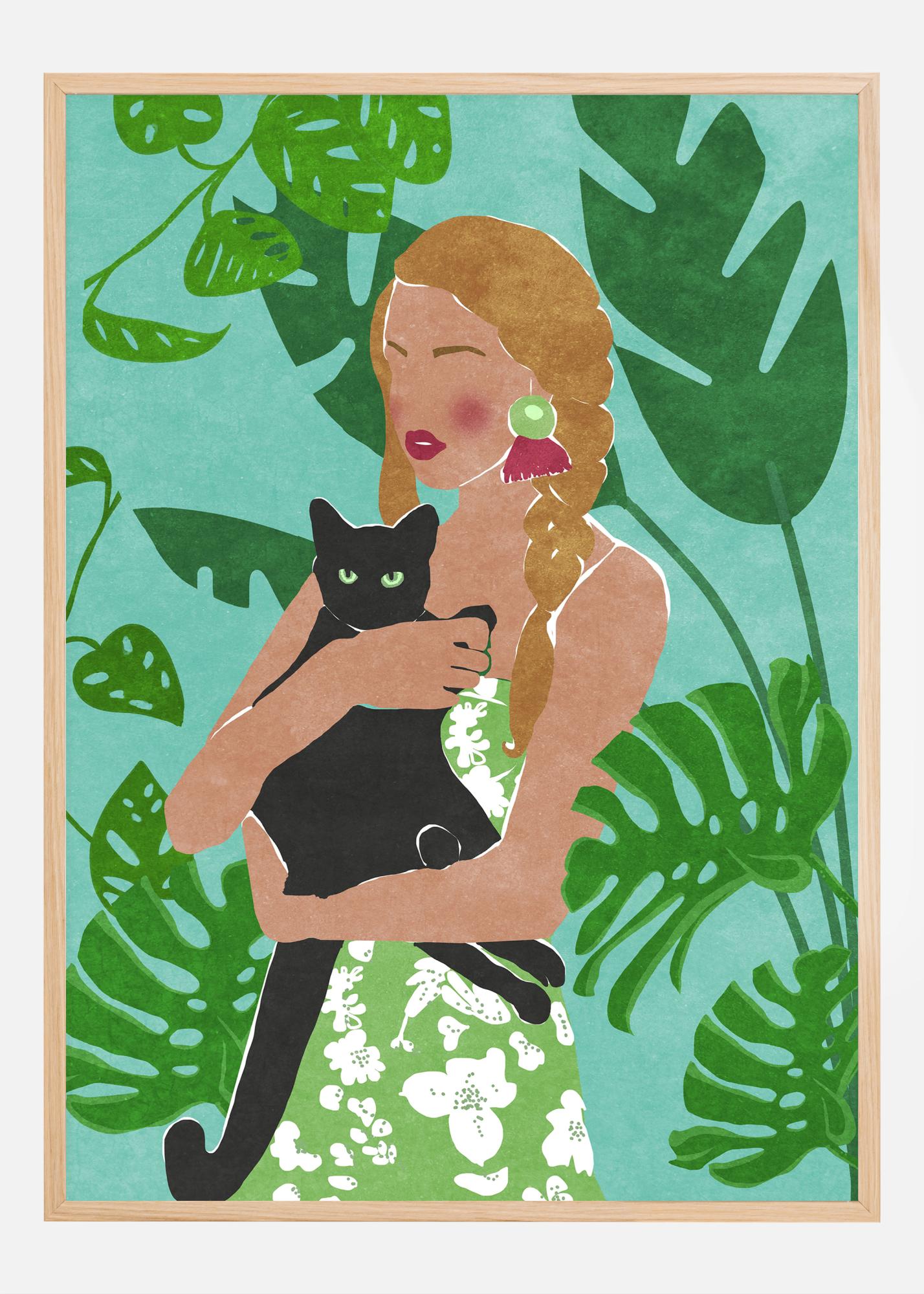 Ez a bájos poszter minden macskakedvelő szívét megnyeri meleg és hívogató illusztrációjával. Egy nőt ábrázol, aki szeretettel öleli fekete macskáját, buja lombozattal körülvéve. A motívum harmóniát és közösséget sugároz, biztonságérzetet és kikapcsolódást közvetítve. A nyomat ideális azoknak, akik szeretnék becsempészni otthonukba a természet és az állatok iránti szeretetet, és olyan oázist létrehozni, ahol emberek és háziállatok egyaránt jól érezhetik magukat.
