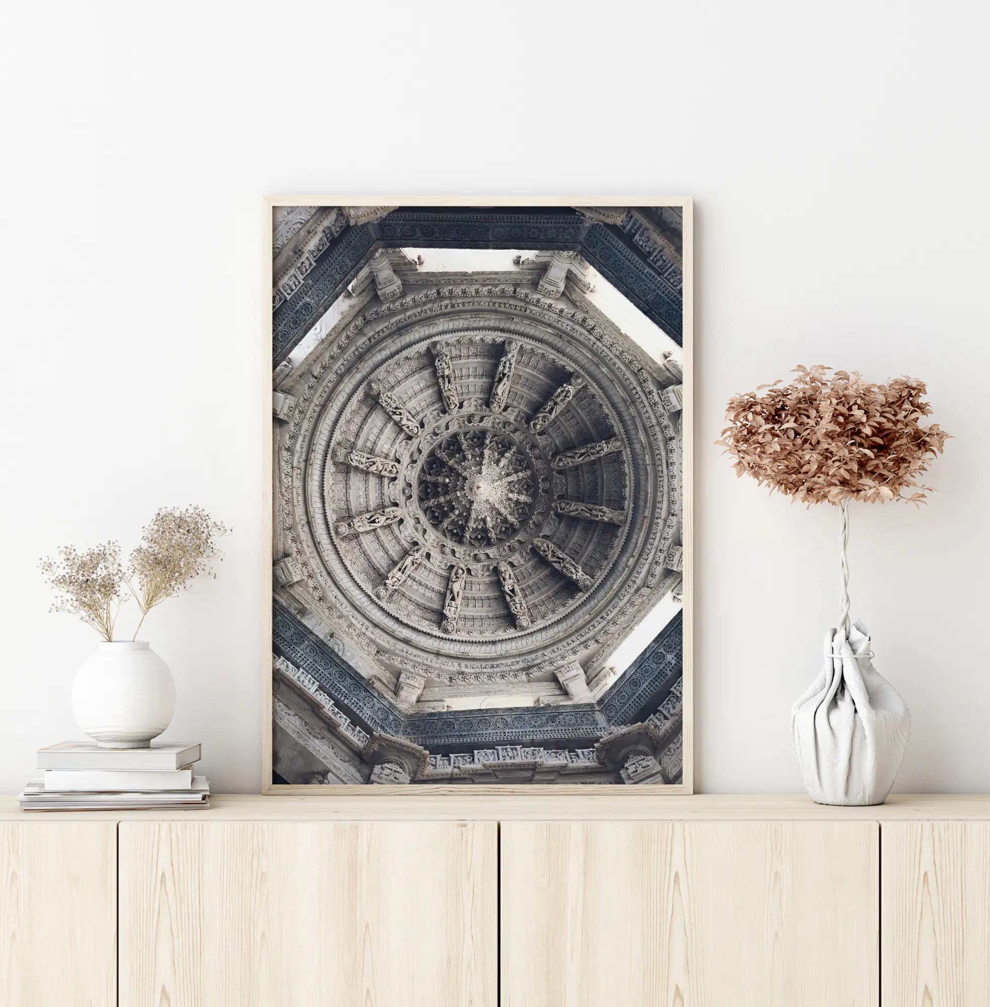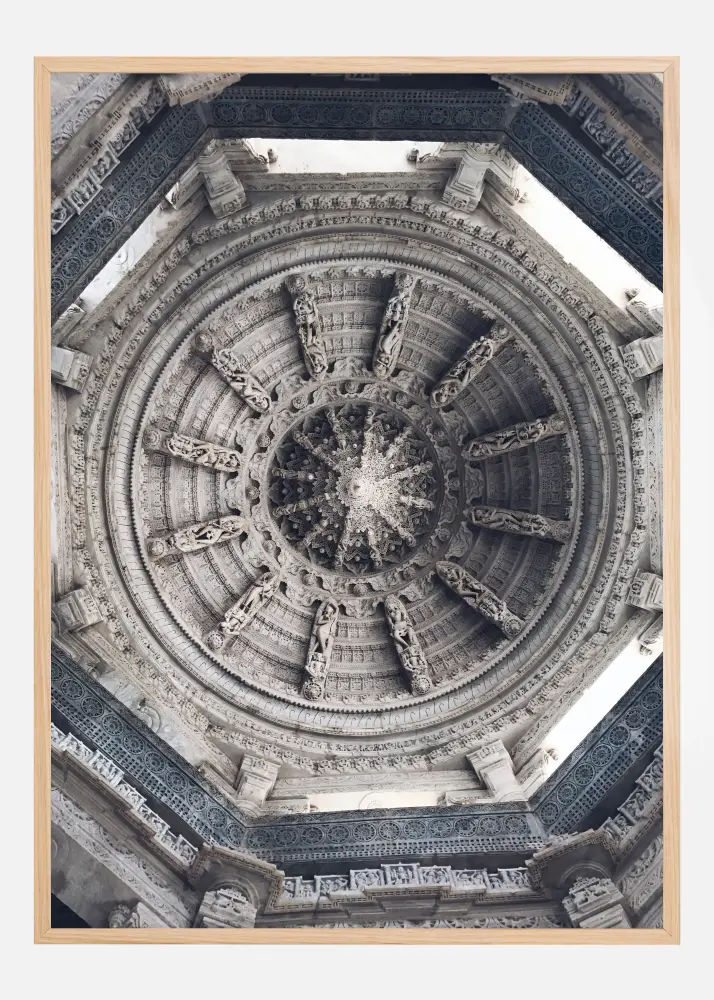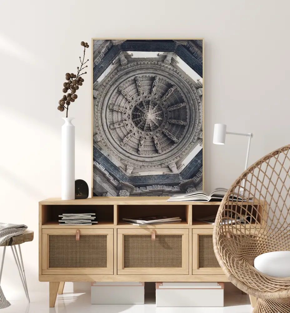 Egy fekete-fehér poszter szürke tetővel. A tető körökkel van kialakítva, és úgy néz ki, mint egy hajókormány. Egy nyolcszög veszi körül, és mindenhol geometriai formák vannak. Adj egy kis extra életet a lágy kék falnak ezzel a tetőposzterrel.