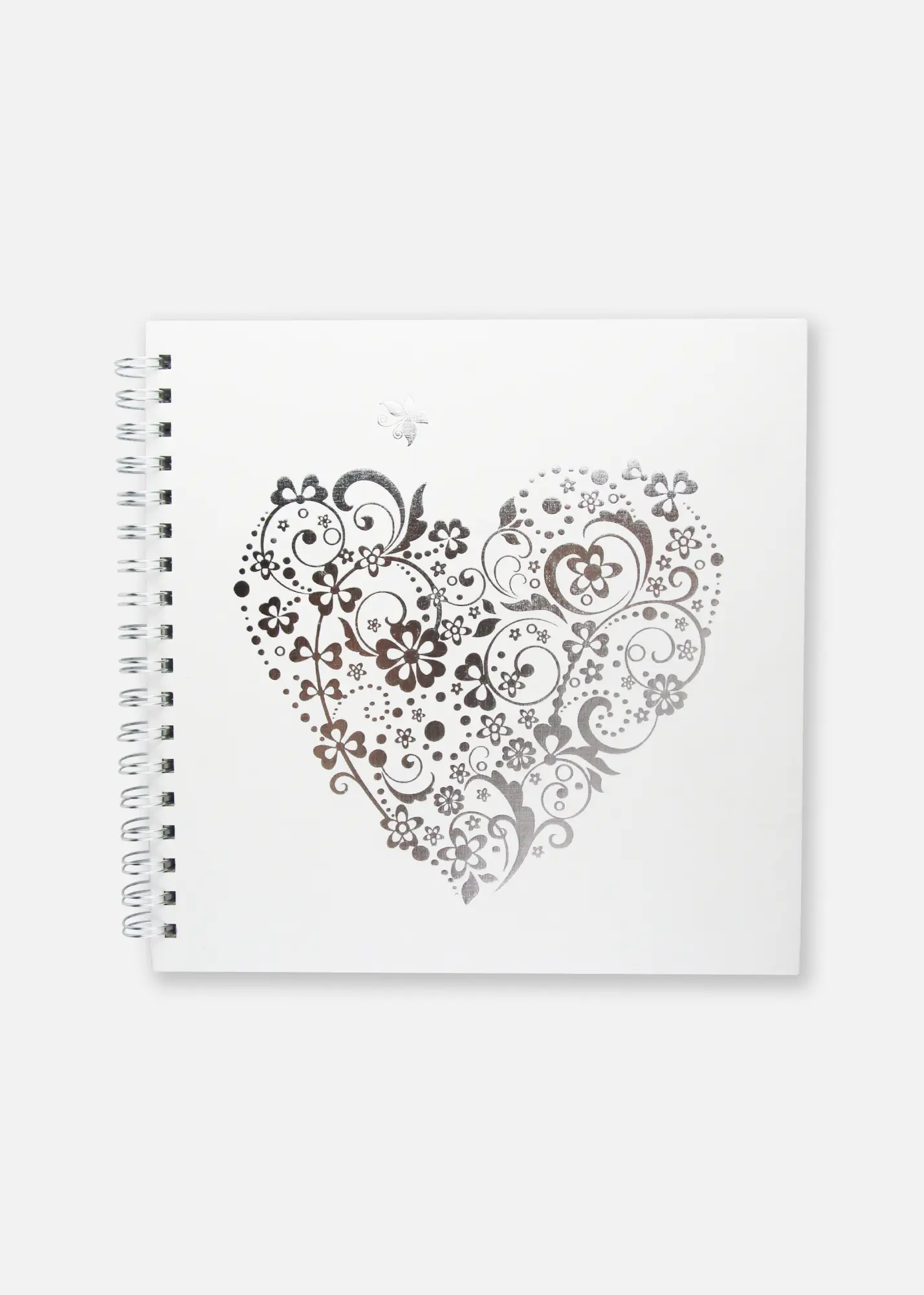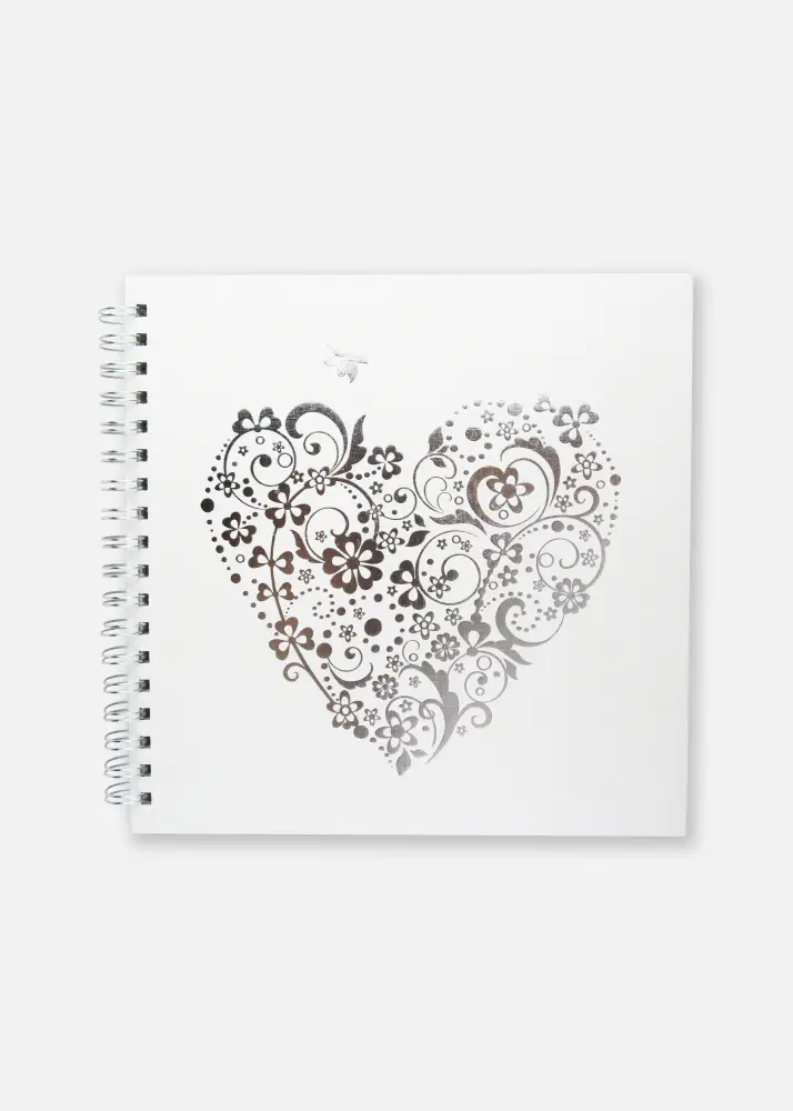 Aranyos, spirálkötésű album fehér színben, 18x18 cm méretben. Az elejére egy ezüstös szívet nyomtattak finom virágrészletekkel. Az album 24 savmentes fehér lapot tartalmaz, és tökéletes album, amely elöl maradhat, hogy lapozgasson benne anélkül, hogy túl sok helyet foglalna.
