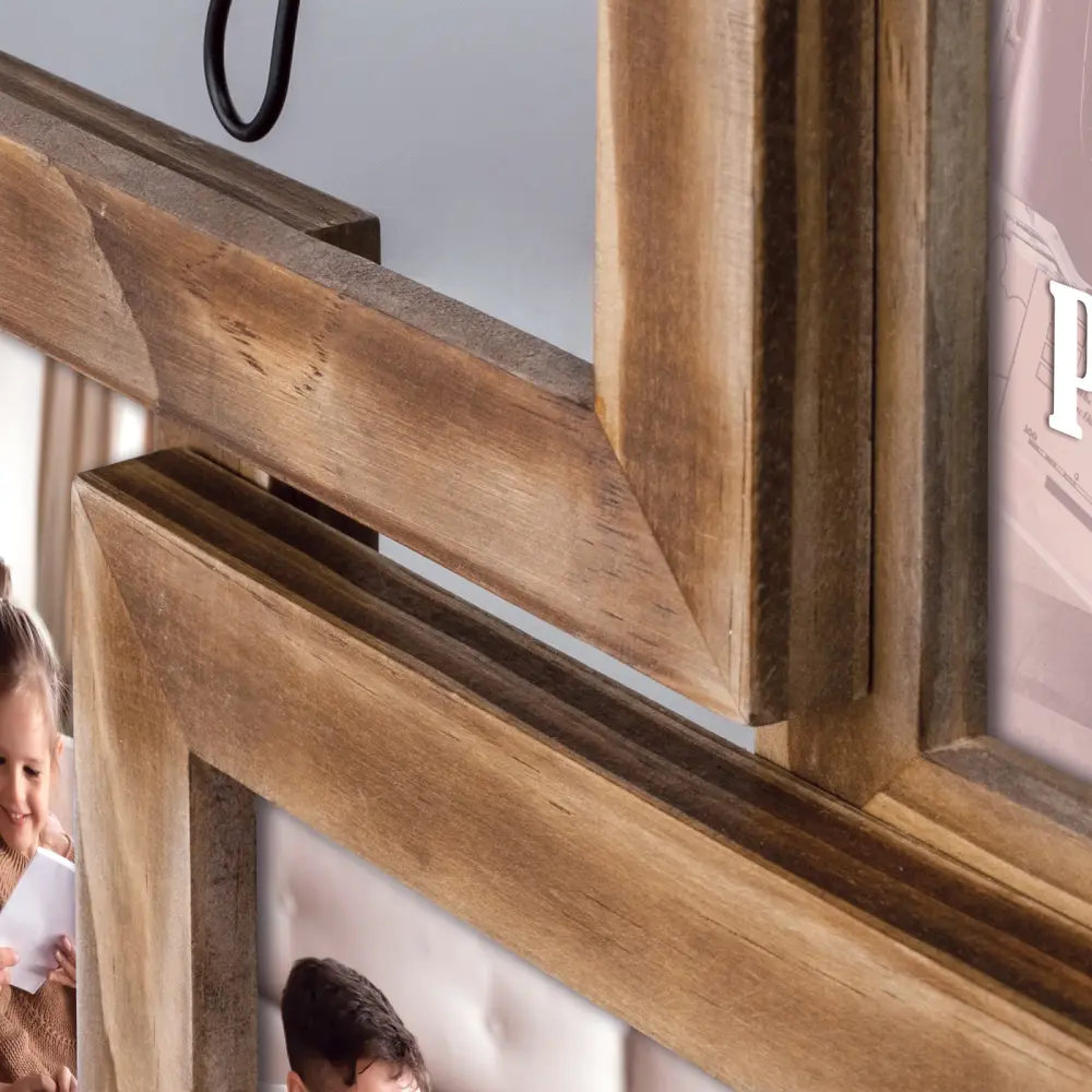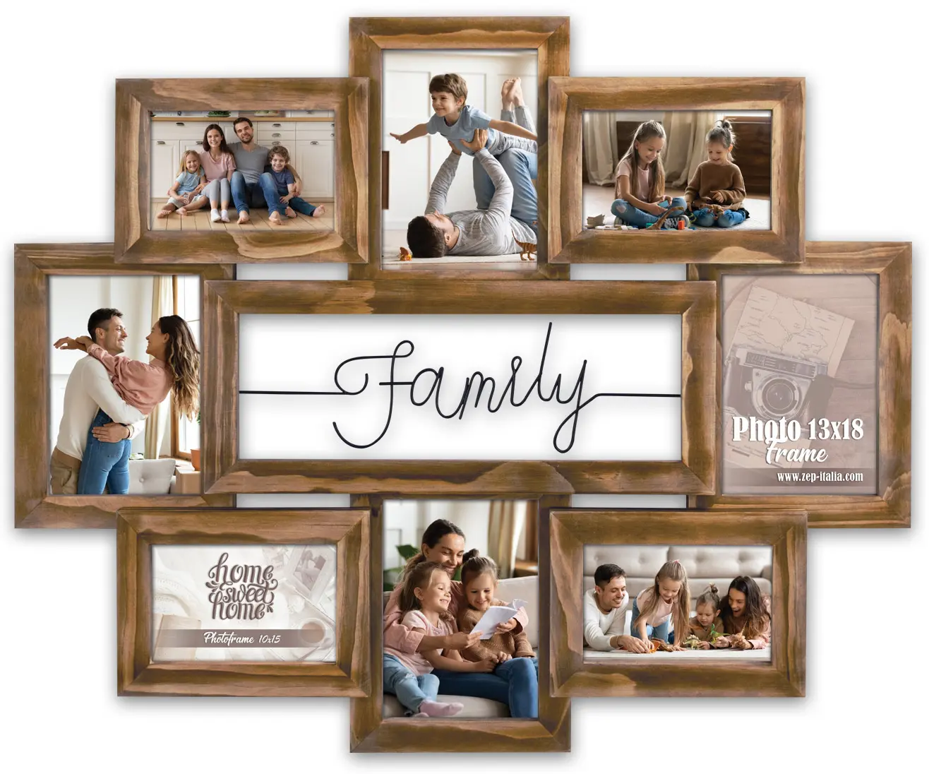 Ez a szép kollázs keret tökéletes arra, hogy felelevenítse legjobb családi emlékeit és bekeretezze! A kollázs keret meleg fa árnyalatban, barnában pompázik, és a keretek között a „family” szó fekete betűkkel szerepel. A keret 8 képet képes befogadni 10x15 cm és 13x18 cm kép méretben. Fali tartóval rendelkezik.