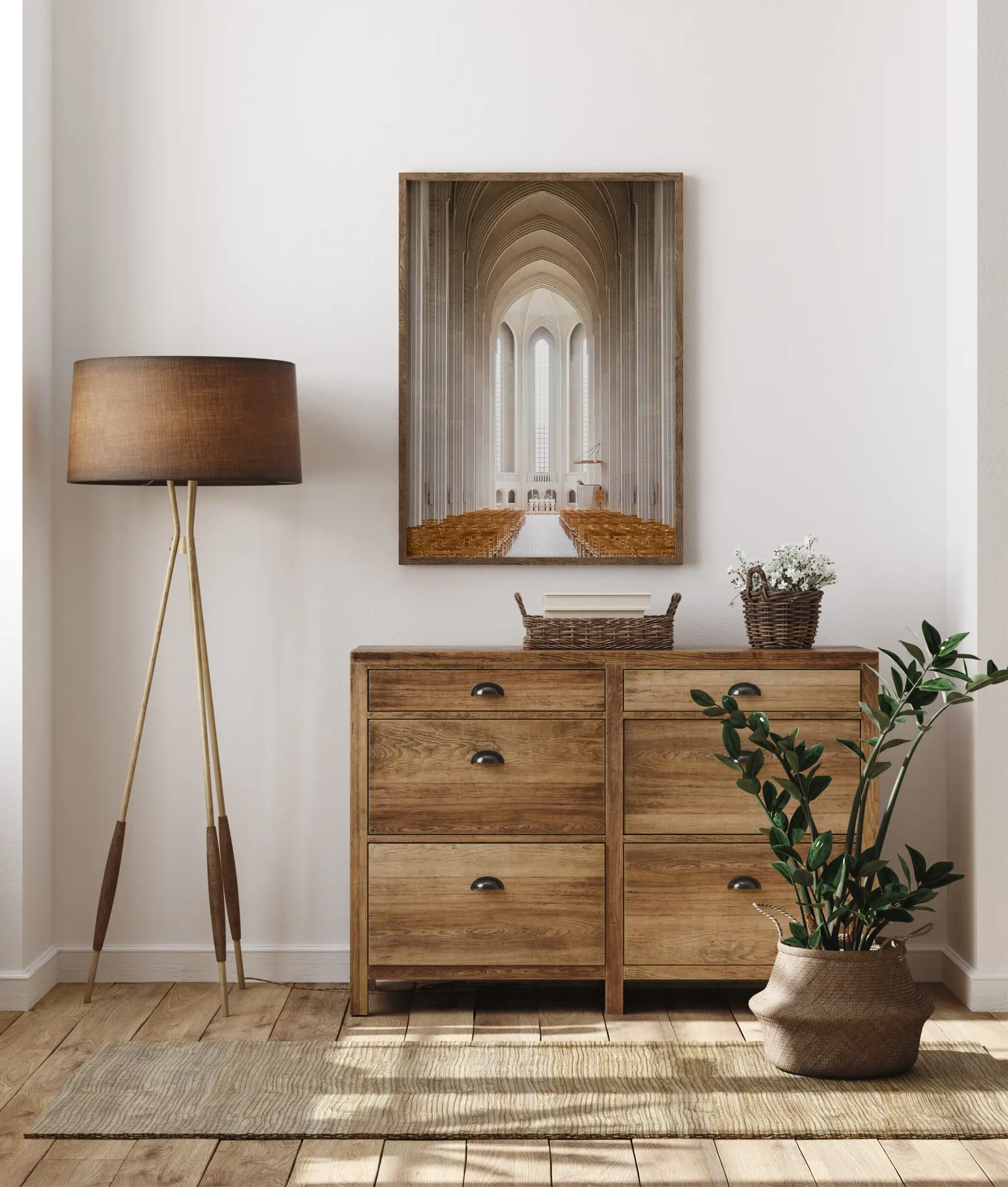 Romantikus poszter egy templom belsejéről. Világosbarna székek szegélyezik a folyosót hosszú sorokban mindkét oldalon. A gótikus ívek keretezik a művet, amelyek a tekintetet a folyosó végén lévő világos fehér fény felé vezetik. Menj el a templomba otthonról, amikor ez a vallásos poszter otthon függ.
