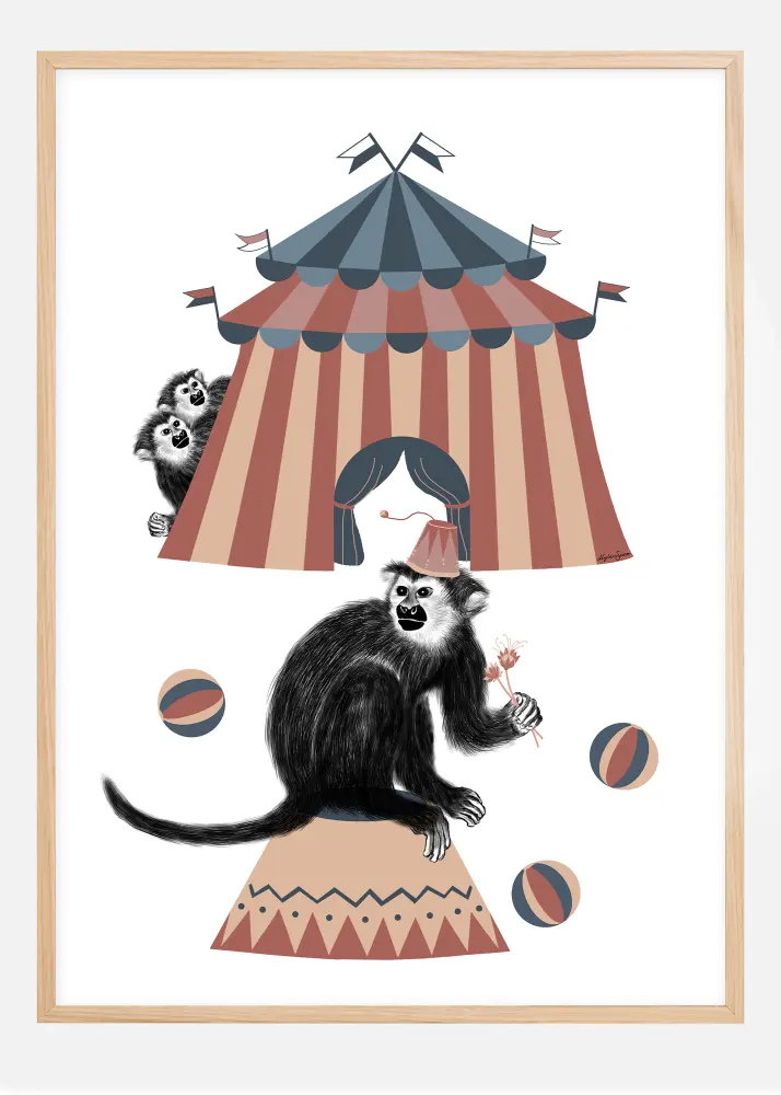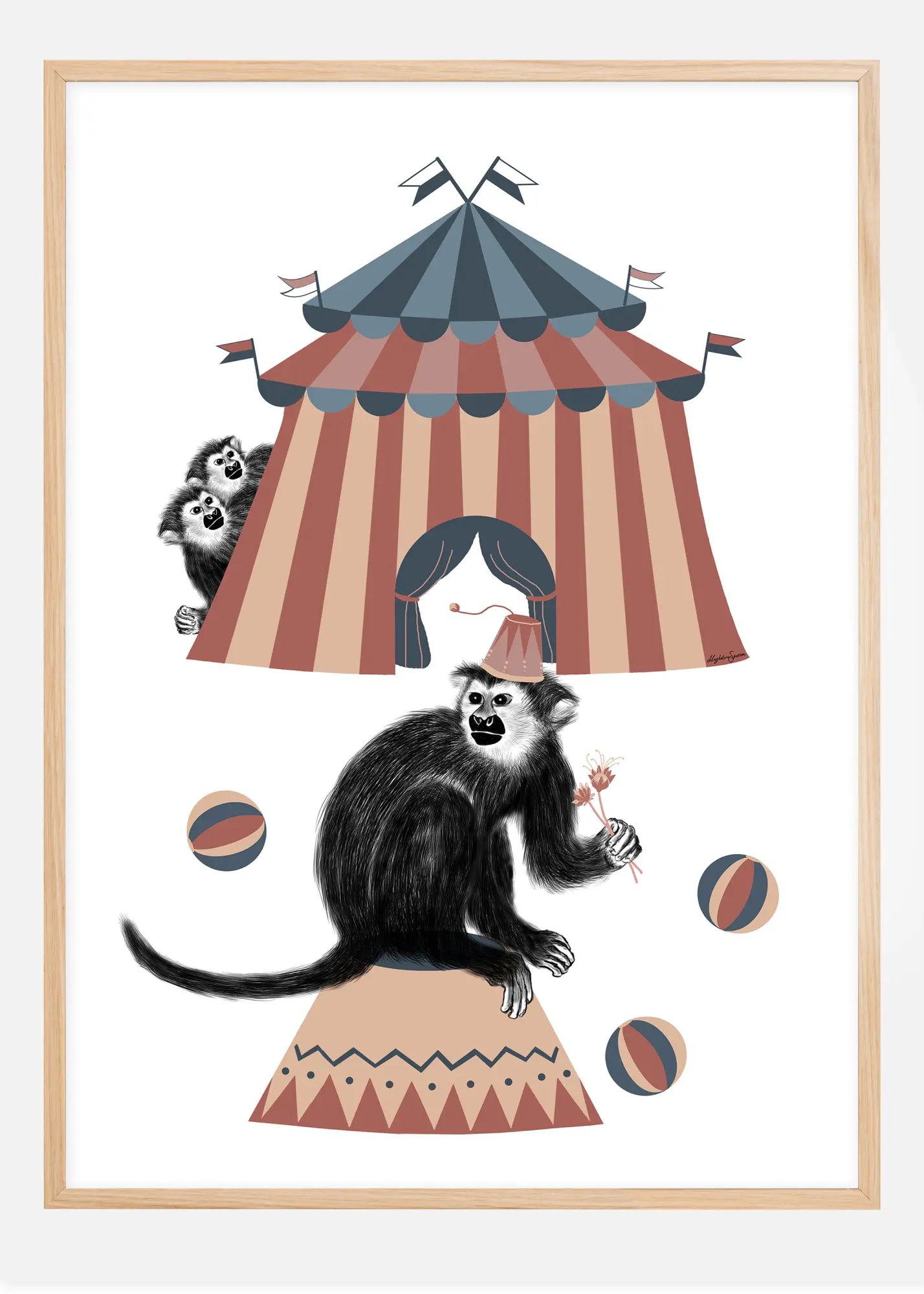 Egy szórakoztató poszter cirkuszi majmokkal és egy cirkuszi sátorral. Egy majom ül egy zsámolyon és fez-sapkát visel, valamint virágokat tart. Három labda található alatta. Két további majom rejtőzik a cirkuszi sátor mögött. Adj házadnak bohócságot ezzel a képpel a falon.