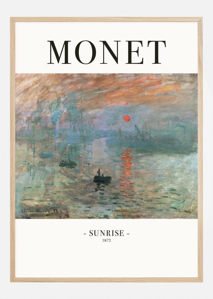 Ez a poszter Claude Monet remekművét, az 'Impression, Sunrise' című festményt tükrözi, amely az impresszionizmus nevét adta. Az 1872-es mű egy ködös kilátást kínál Le Havre kikötőjére hajnalban, ahol a nap egy vérvörös gömb, amely visszatükröződő fényét vetíti a nyugodt vízre. Monet lágy, de határozott ecsetvonásai és az álomszerű színpaletta egy nyugalom és várakozás érzetét kelti, amit minden új nap hoz magával.
