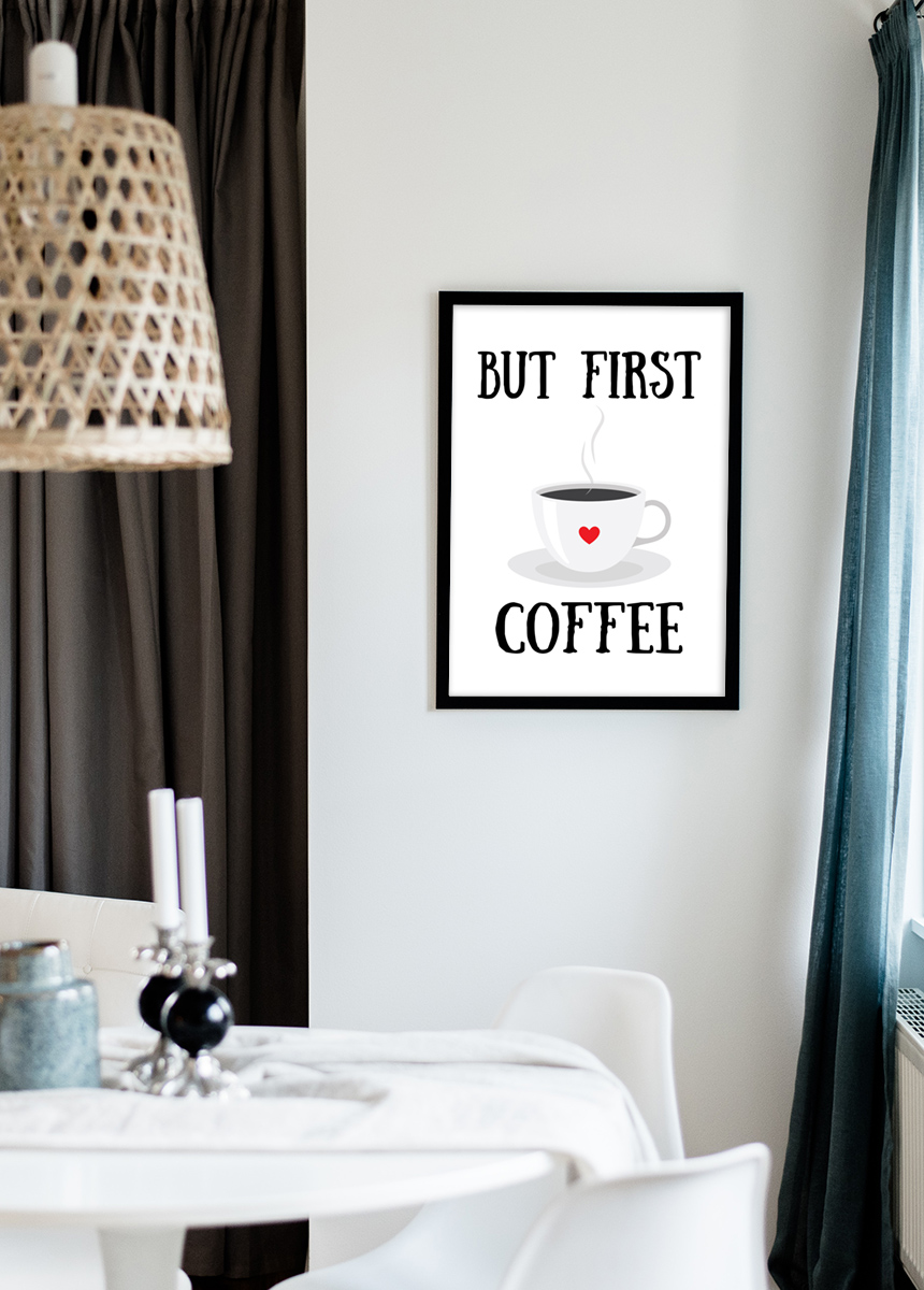 Poszter egy kávéscsésze illusztrációjával, üzenettel a kávékedvelő személy számára. Az édes motívum szívvel a csészén szép ajándék, és jól mutat a konyhában egy vidéki vagy retro ihletésű berendezés részeként. Egészítse ki a posztert egy képkerettel, amely hasonló stílusú, mint az illusztráció és a berendezés, hogy harmonikus érzést teremtsen az otthonában.