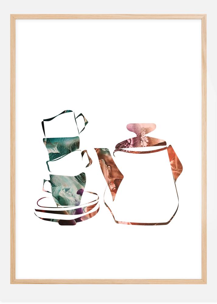 Egy absztrakt poszter kávéval és teával, valamint csészékkel, csészealjakkal és egy kannával. Mindegyik absztrakt márványos mezőkből készült türkiz és narancssárga színben egy fehér háttéren. Készülj fel a kedvenc forró italodra, miközben minden reggel ránézel erre a képre.