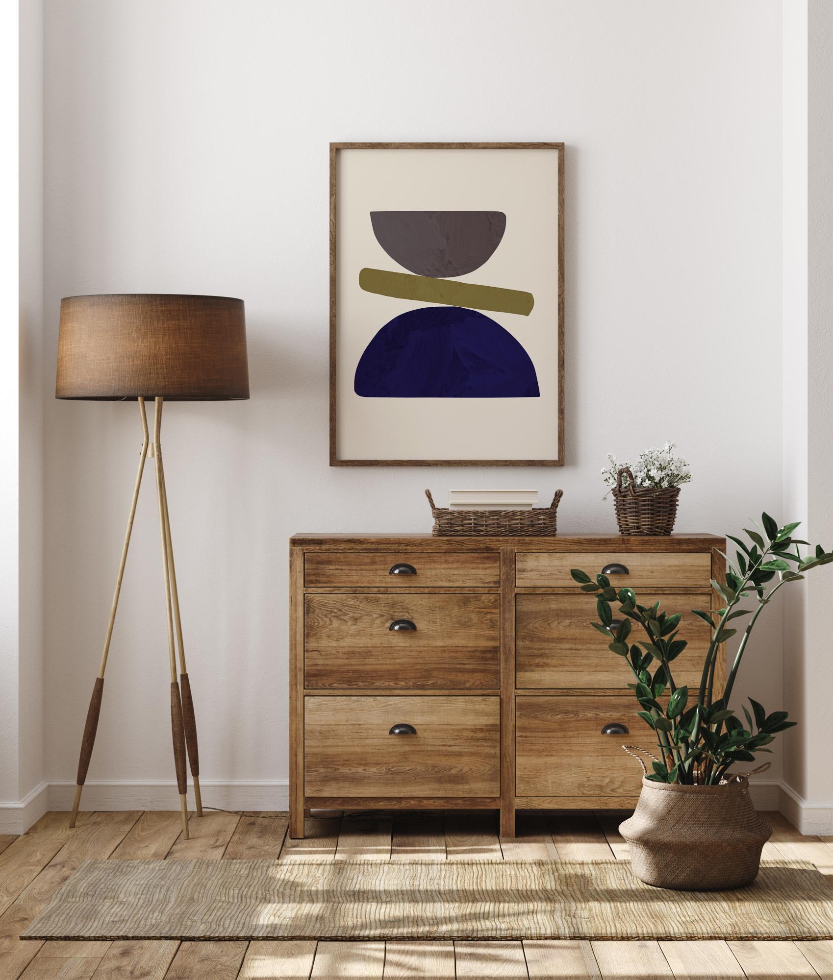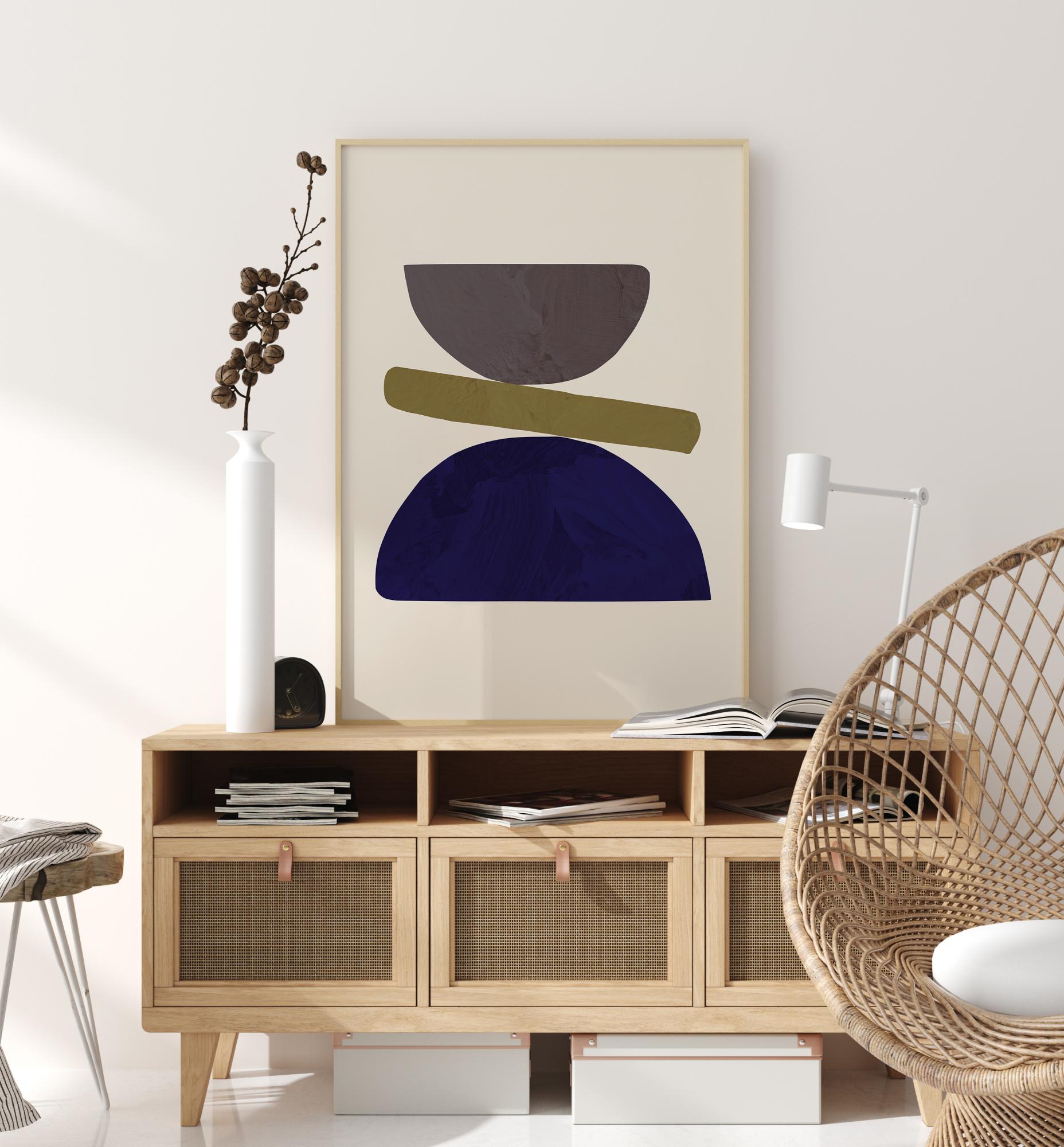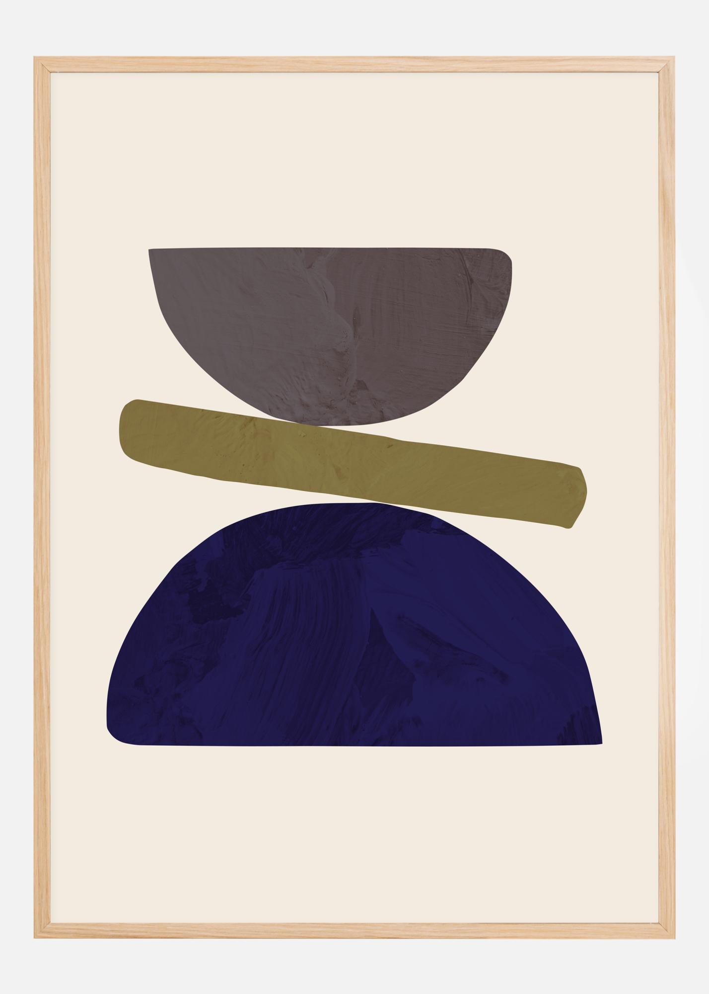 Poszter az egyensúlyról a geometria által. Egy nagy kék félkör egy vékony zöld hosszúkás formát egyensúlyoz a görbületén. Ezen felül szürke félkörök homokóraformát alkotnak. Töltsön órákat ezzel az alkotással szemben, és próbálja meg megtalálni a többi formát benne.