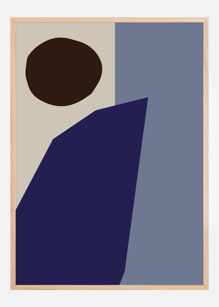 Elegáns plakát szögletes formákkal és egyszínű blokkokkal. Egy szép sötétkék forma húzódik végig a képen balról, míg egy téglalap alakú világoskék forma osztja a képet. Fölötte egy fekete kör látható fehér háttéren. Jegyezze meg ezt a képet minden reggel, amikor a folyosóján lóg.