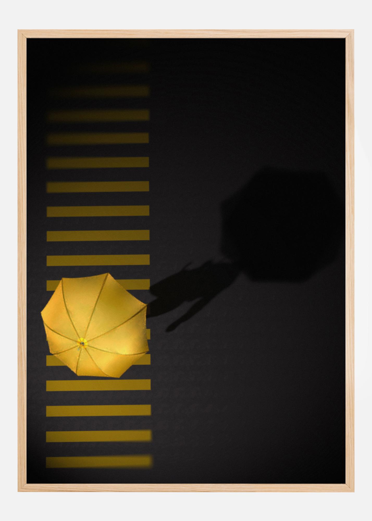 Egy gyalogos légifelvétele sárga esernyővel egy gyalogátkelőhelyen. A gyalogátkelő halványsárga vonalait szétosztja a színes sárga esernyő. A gyalogos árnyéka plusz drámaiságot ad a képnek, így tökéletes lakberendezési elem.