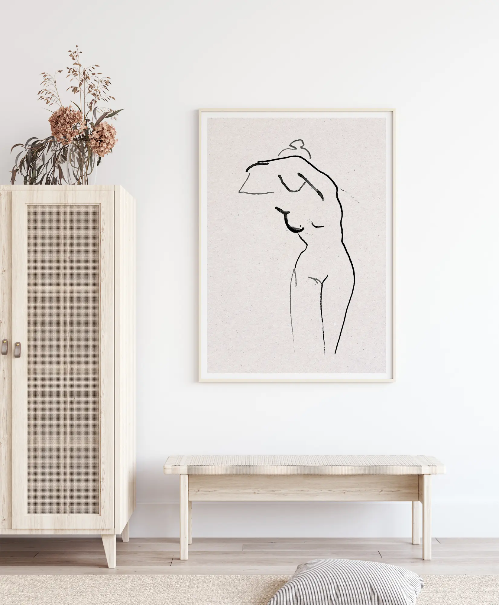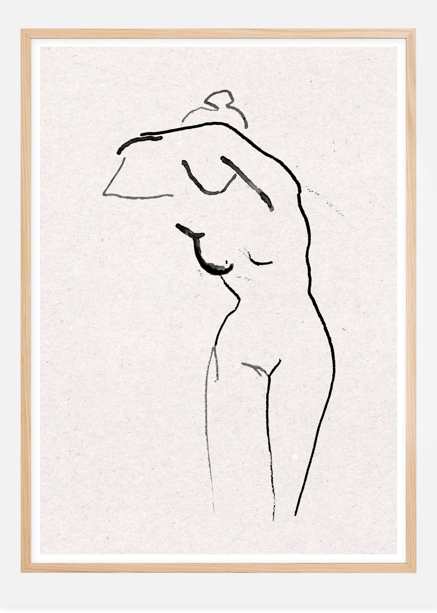 Egy grafikus művészeti poszter akvarellben, amelyet Cora Művészet és Illusztráció készített. Itt egy nő alakul ki vékony fekete vonalakkal egy világos szürke háttér előtt. A finom motívumot ezután egy kissé keskenyebb fehér paszpartu veszi körbe.