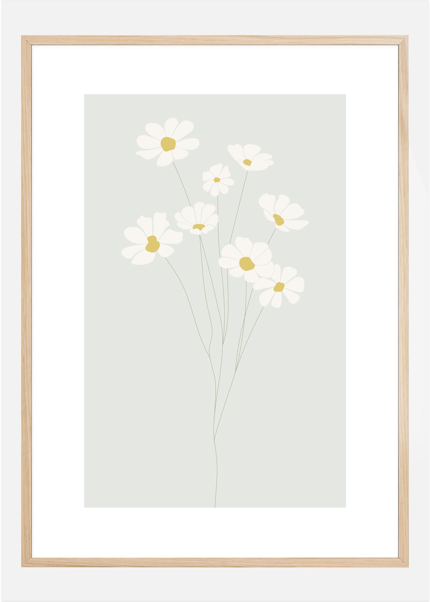 Egy finom poszter százszorszépről készült lenyomattal, finom megjelenéssel. Az egyszerű fehér és sárga virágok felfelé nyúlnak a vékony szárakon egy lágy fakó kék háttér előtt. Akaszd fel ezt a képet a gyermeked hálószobájában a nyugtató, de édes hangulat érdekében.