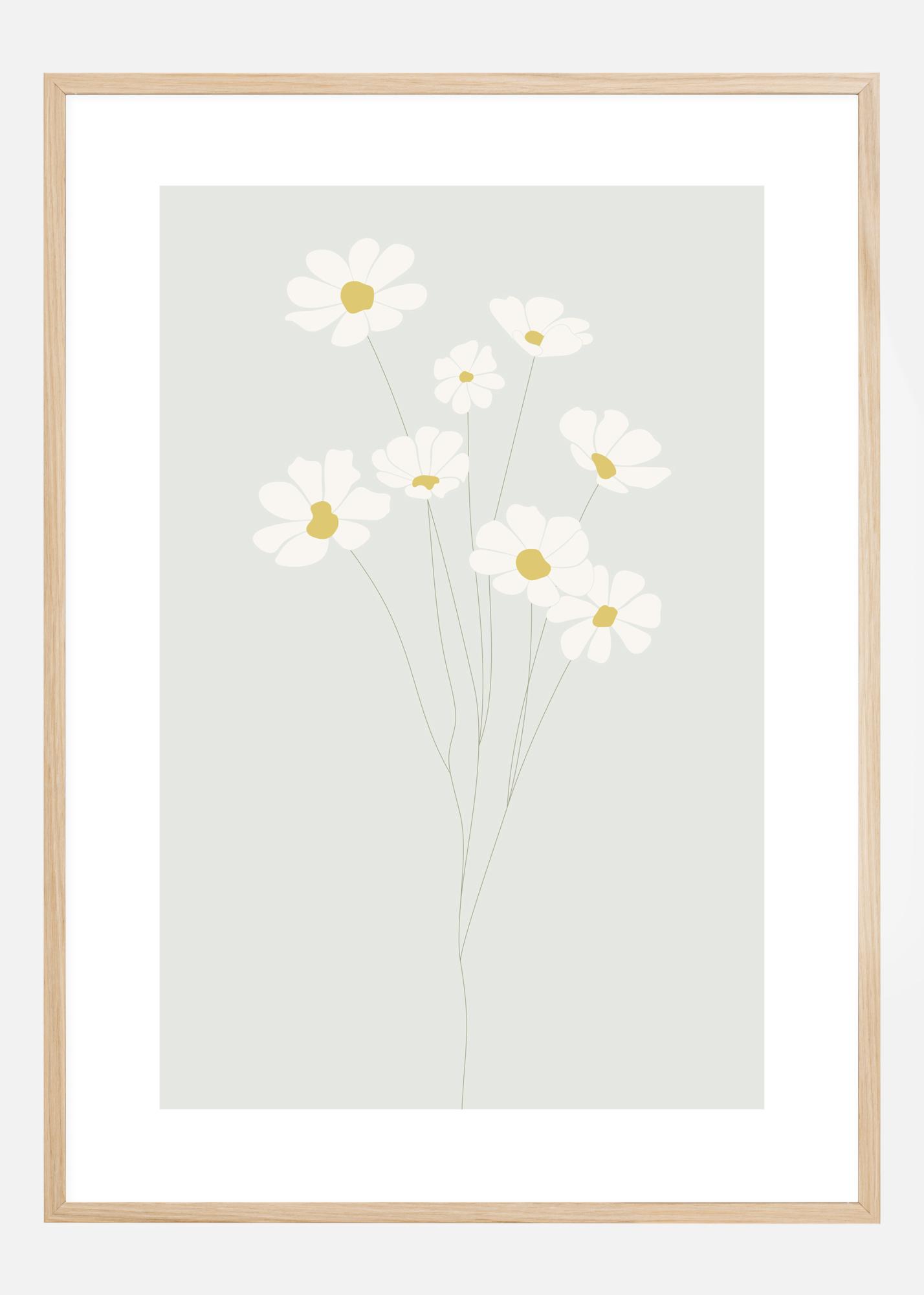 Egy finom poszter, amely egy százszorszép nyomtatását ábrázolja, törékeny megjelenéssel. Az egyszerű fehér és sárga virágok vékony szárakon nyúlnak felfelé egy lágy, fakó kék háttér előtt. Akassza ki ezt a képet gyermeke hálószobájába egy pihentető, de kedves atmoszféra érdekében.