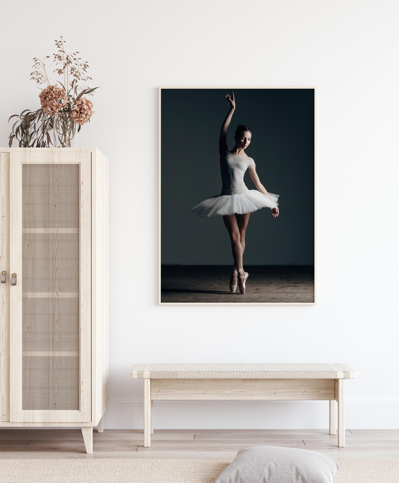 Egy fénykép poszter egy kecses balett-táncosnőről, aki lábujjhegyen áll, egyik karját a feje fölé nyújtva. A kép világítása miatt az arca és fehér ruhája szépen kontrasztál a kissé sötétebb környezettel szemben.