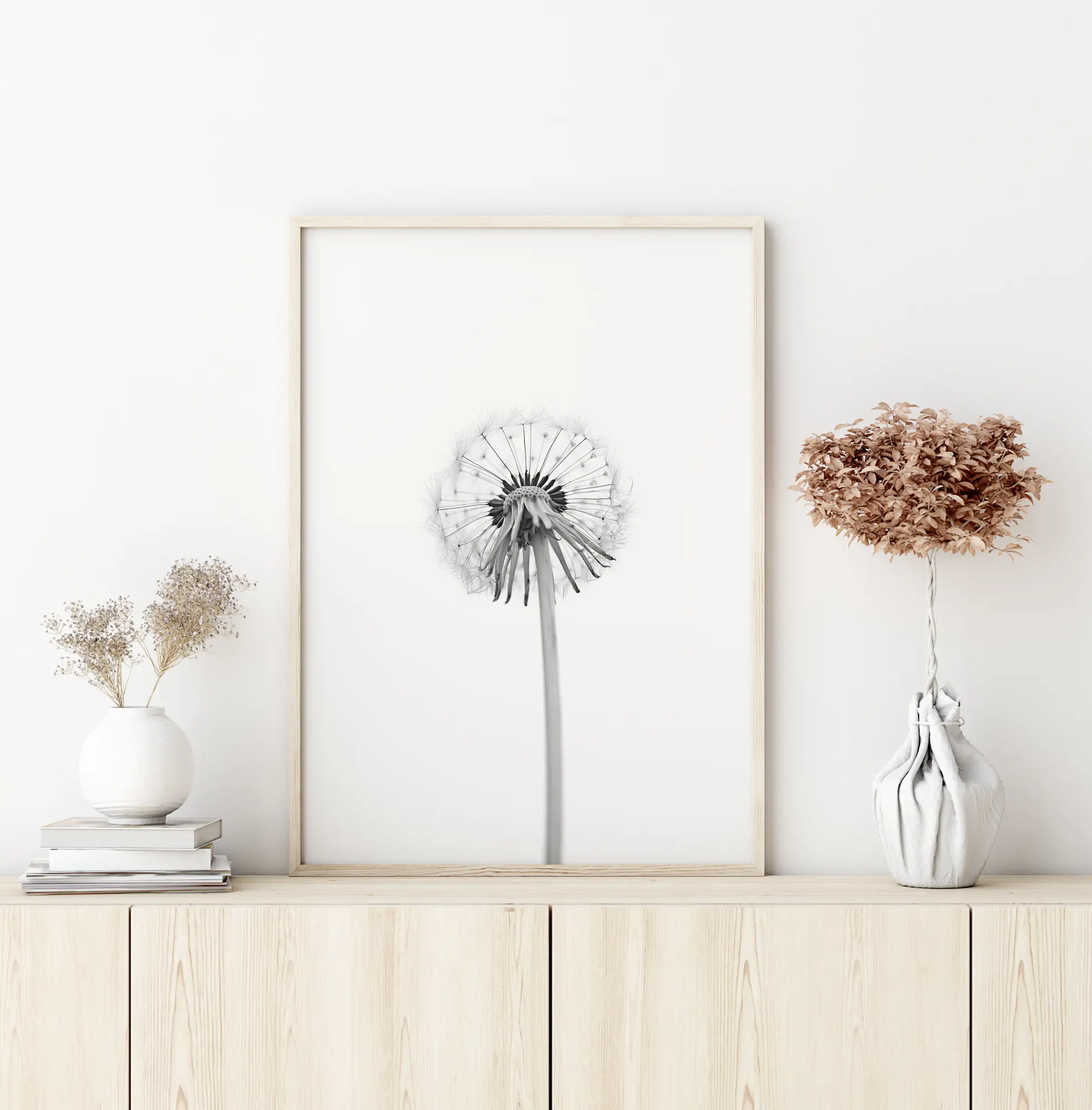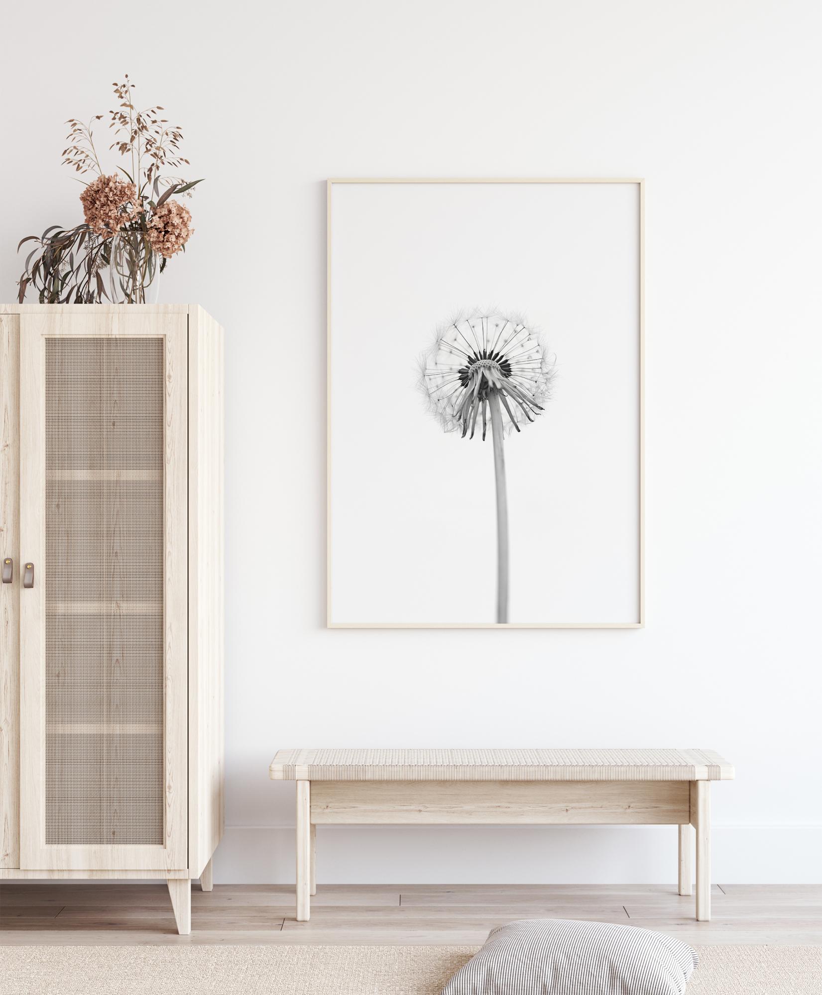 Egy világos, tiszta természetposzter pitypanggal fehér háttérrel. Ez a főként fehér kép feltűnően fog mutatni egy élénk kék vagy zöld falon. Ez a kép tökéletesen illik egy galériafalra.