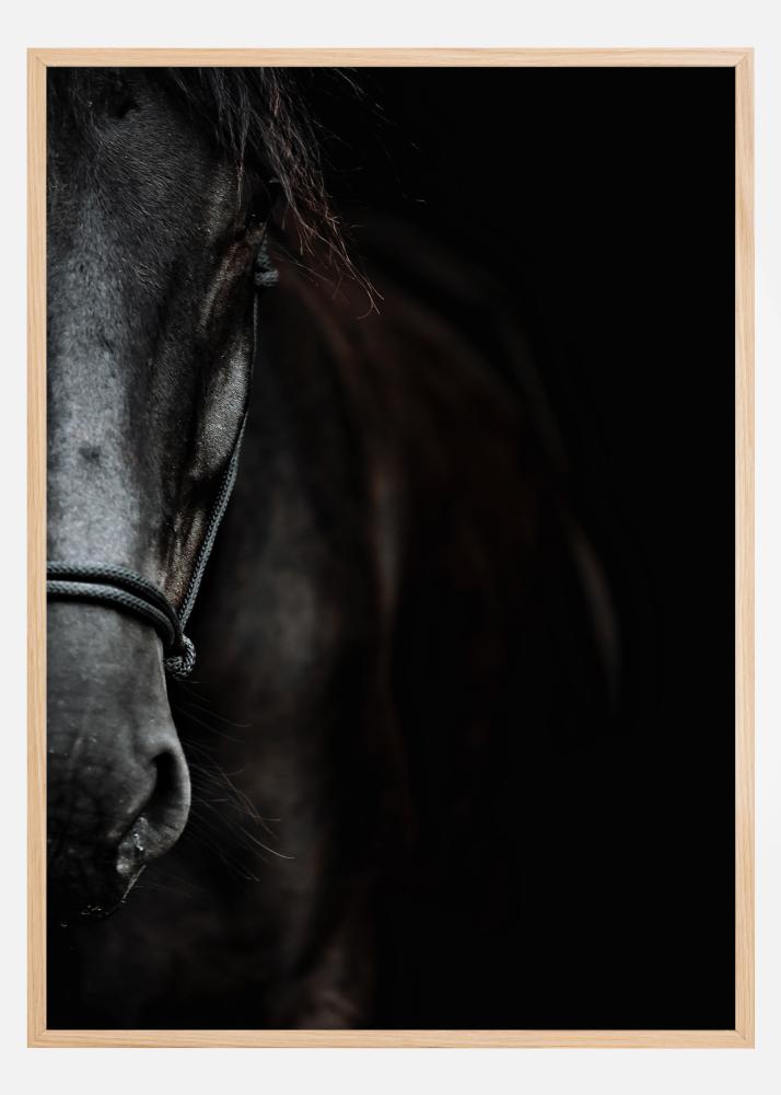 Egy fényképes poszter lókedvelőknek! Itt van egy sötét ló, amelyet közvetlenül szemből fényképeztek egy sötét háttér előtt. Az arca szépen meg van világítva, míg a ló hátsó részei beleolvadnak a háttérbe. Egészítse ki valami mással a széles keretválasztékunkból.