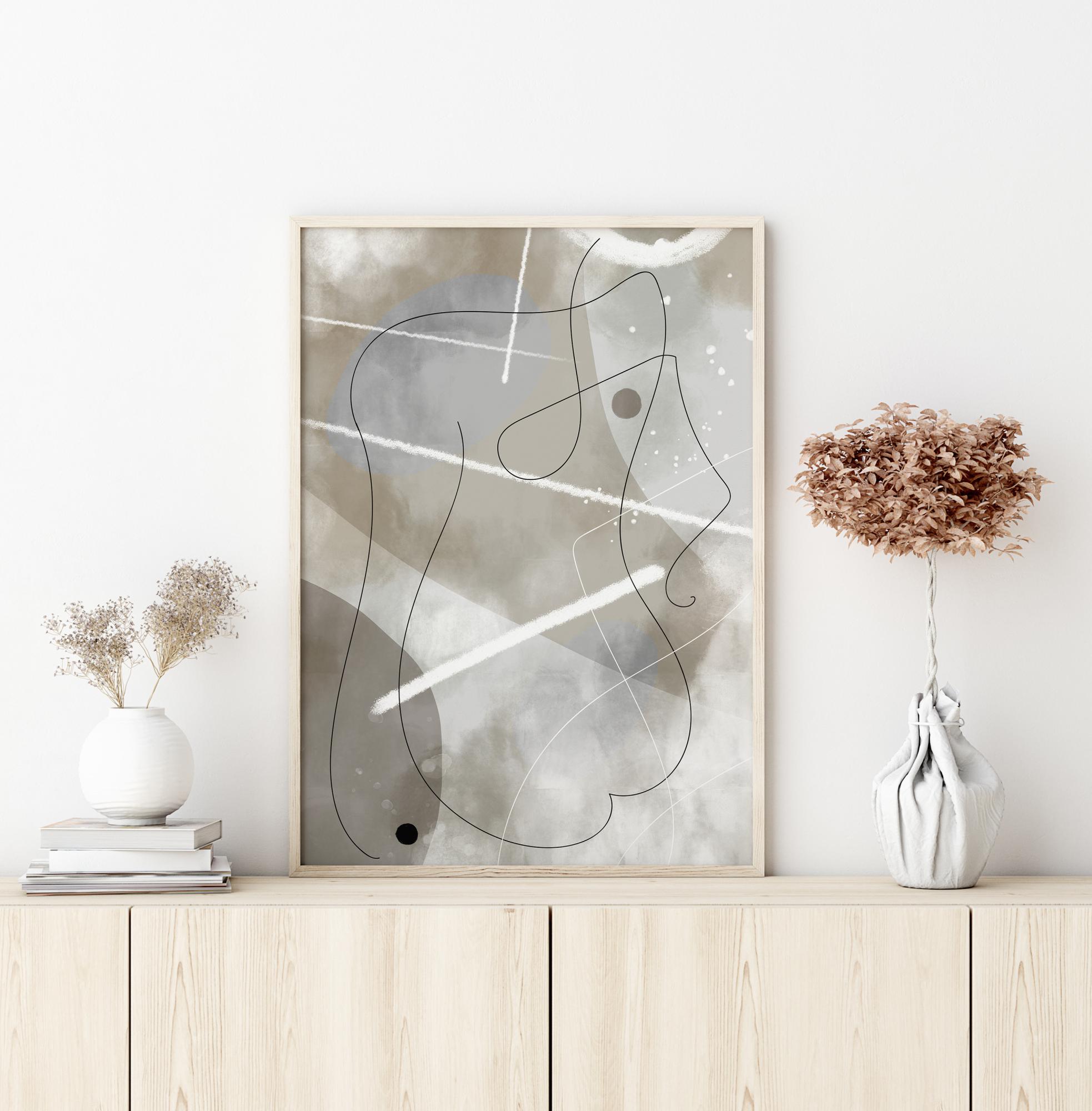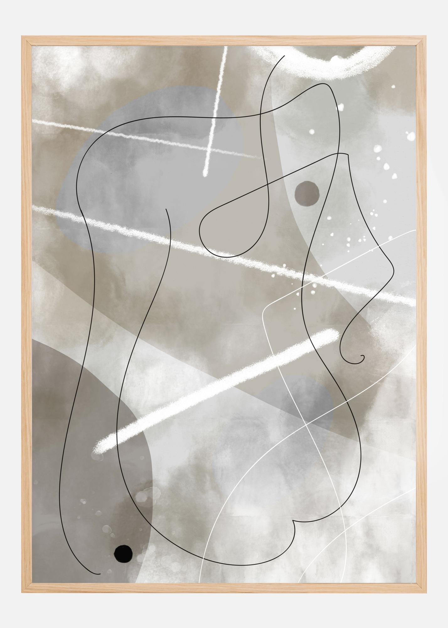 Egy absztrakt poszter puha vonalakkal ábrázolt arccal. A vékony vonalak mögött az arcnak van egy homályos, éteri kék és szürke háttér. Más absztrakt vonalak és formák úsznak el, ami egy összetettebb alkotássá teszi ezt. Fejtse meg ezt a képet otthona kényelmében.