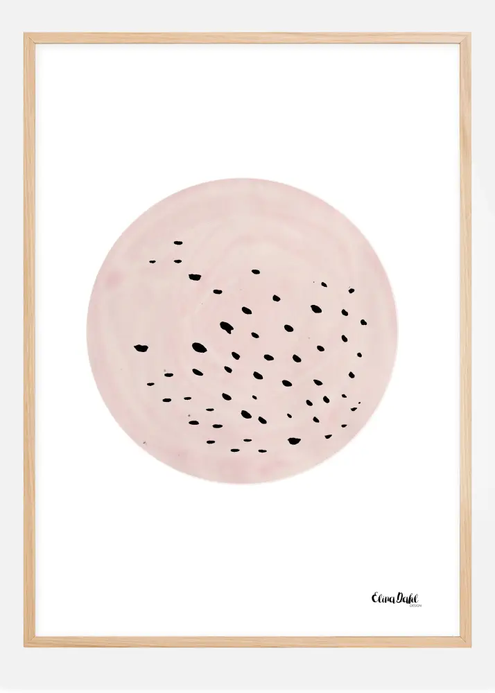 Egy absztrakt poszter fekete pontokkal egy bézs-rózsaszín körben. Ez a kör tele van apró pontokkal a felületen. A labda fehér háttéren van elhelyezve. Párosítsd ezt a különös, de meggyőző képet egy erős, merész háttérrel, hogy igazán érdekes művészeti installációt hozz létre.