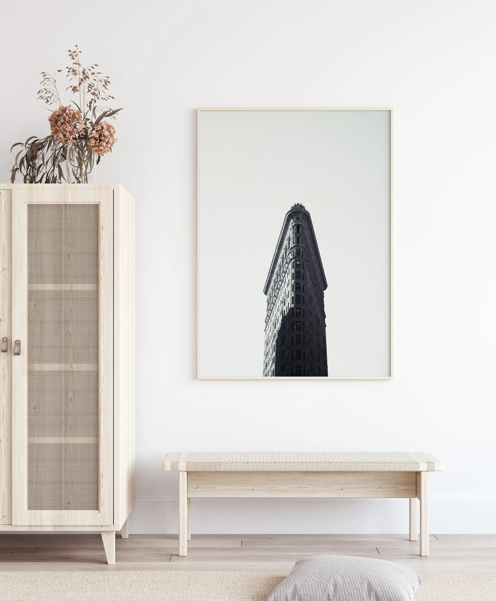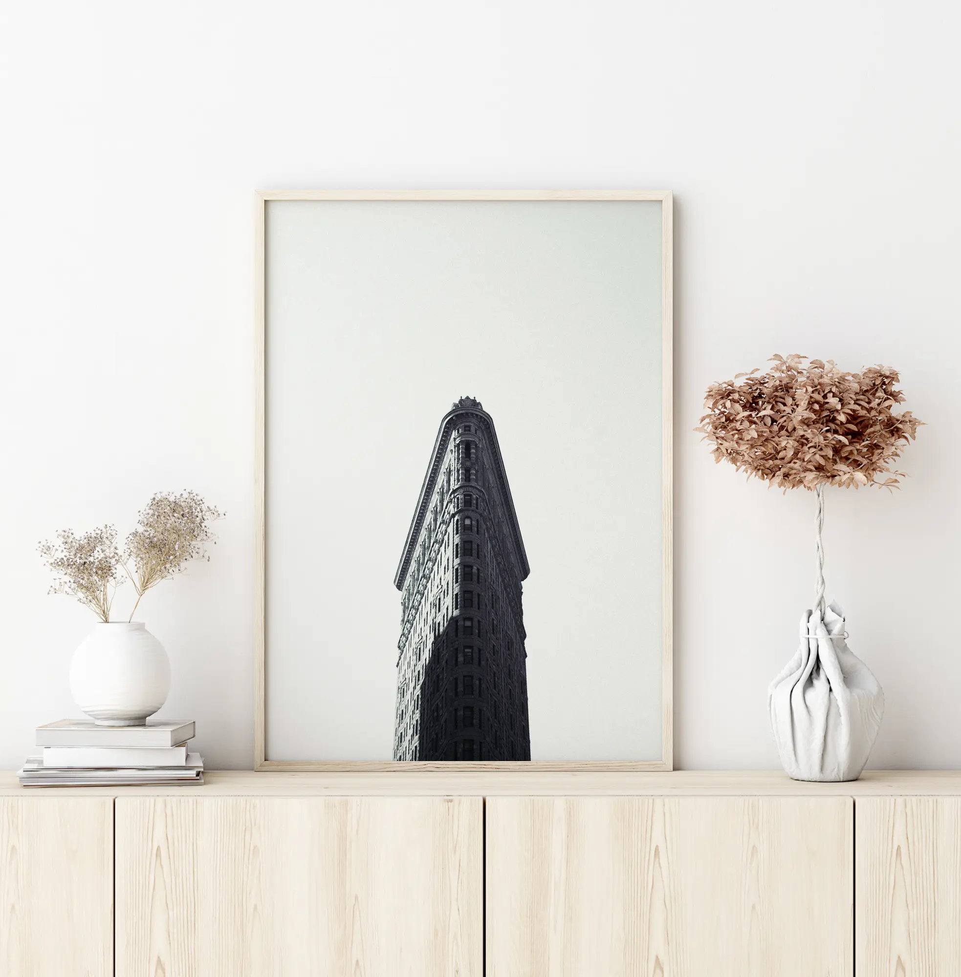Egy építészeti poszter, amely egy régi lakónegyed elülső sarkát ábrázolja. Az épület eleje úgy néz ki, mint egy hajó orra, és erős kontrasztban áll a fehér éggel. A háromszög alak megragadja a tekintetet, és felfelé vezeti az épületen. Akassza fel ezt a művet egy egyszínű falra, hogy művészi légkört teremtsen.