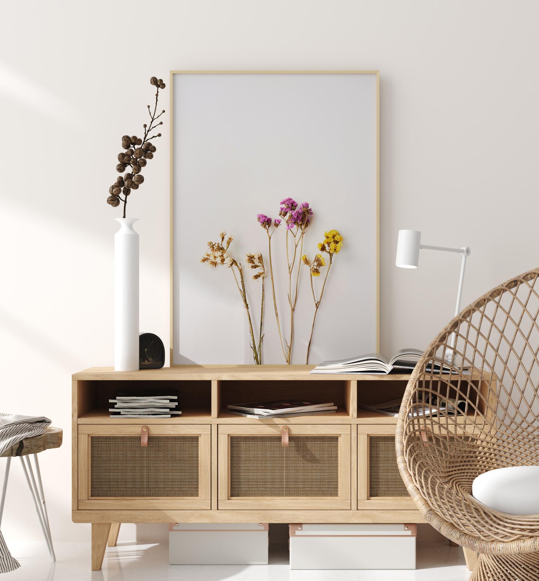 Egy egyszerű poszter háromféle szárított virággal. Hosszú barna szárak különböző színű virágokkal emelkednek fel a kép alsó részéből. Barna, lila és sárga, ezek a virágok éles kontrasztot alkotnak a tiszta fehér háttérrel. Akaszd ki ezt az egyszerű képet a konyhádban egy kis színfoltért.