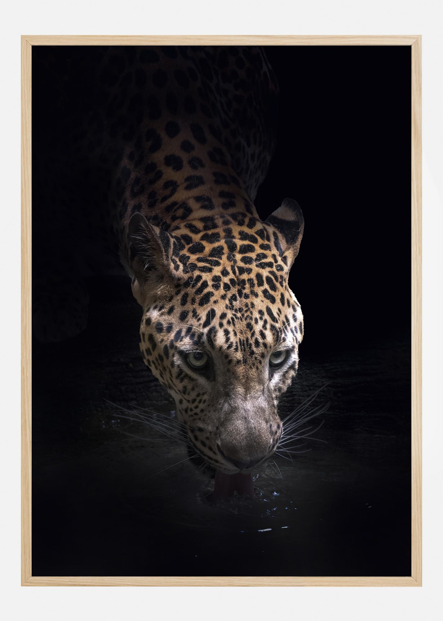Ez a drámai poszter egy intim pillanatban ábrázol egy leopárdot, amint csendesen vizet iszik, egy erőteljes pillanat a vad természetből, amely időben meg van örökítve. A fekete háttér kiemeli a csodálatos bundájának arany színét és a jellegzetes foltokat, közel háromdimenziós hatást keltve. A leopárd a szemlélő felé fordul, tekintetében a vadállatok koncentrációja és jelenléte tükröződik, amely azonnali kapcsolatot teremt az állat és az ember között.