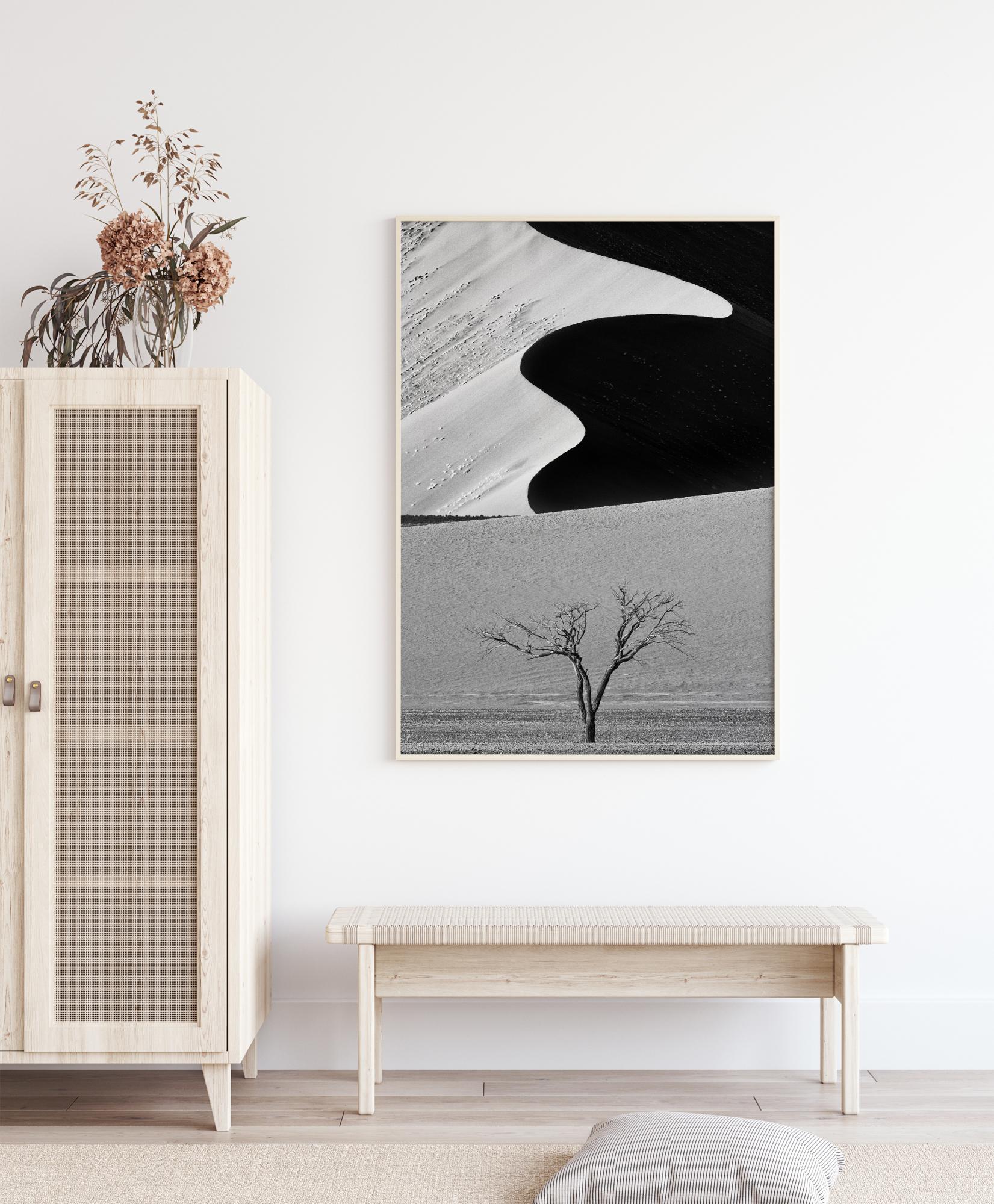 Egy drámai poszter hajlított homokdűnékkel és egy magányos fával. Ez az erőteljes kép a homokdűne fekete-fehér íveit állítja szembe a fa statikus nyugalmával. Keltsen tiszteletet ezzel a képpel.