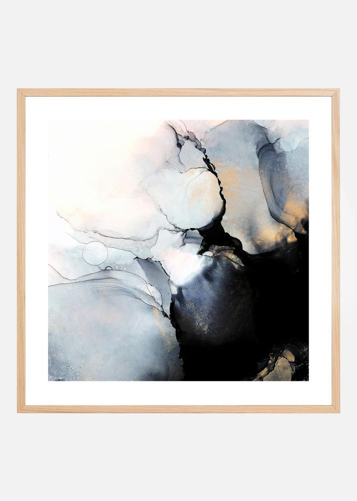 Gyönyörűen absztrakt művészeti poszter akvarell technikával, fekete, kék és arany árnyalatokban, rózsaszín elszórt elemekkel, Gabriella Roberg művész alkotása. Ez a poszter kiválóan illik Gabriella művei közé, például a DAWN műalkotásához.