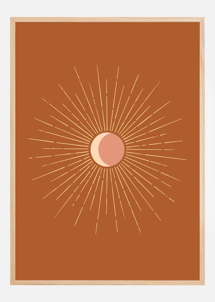 Ez a minimalista és elegánsan tervezett poszter egy absztrakt napfogyatkozással kifinomult és modern kiegészítő bármely falon. Tiszta vonalaival és ragyogó motívumaival a mély terrakotta háttér előtt ez a nyomat a egyszerűség és a kifinomultság tökéletes keverékét képviseli. A design központi eleme, egy vonalakkal való kitöréssel ábrázolt kör, a fényt és energiát szimbolizálja, és dinamikus hatást kölcsönöz a szobának.