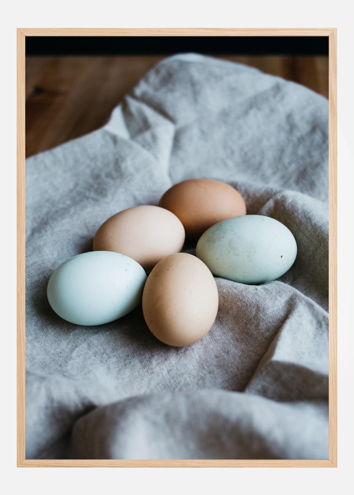 Állókép poszter öt tojással egy fehér konyharuhán az asztalon. A tojások különböző barna és fehér színűek, és úgy tűnik, mintha nemrég tojódott volna. A meleg árnyalatok rusztikus érzést keltenek, ahol értékelheti a természetes, élénk légkört. Tökéletes egy konyhai környezethez.