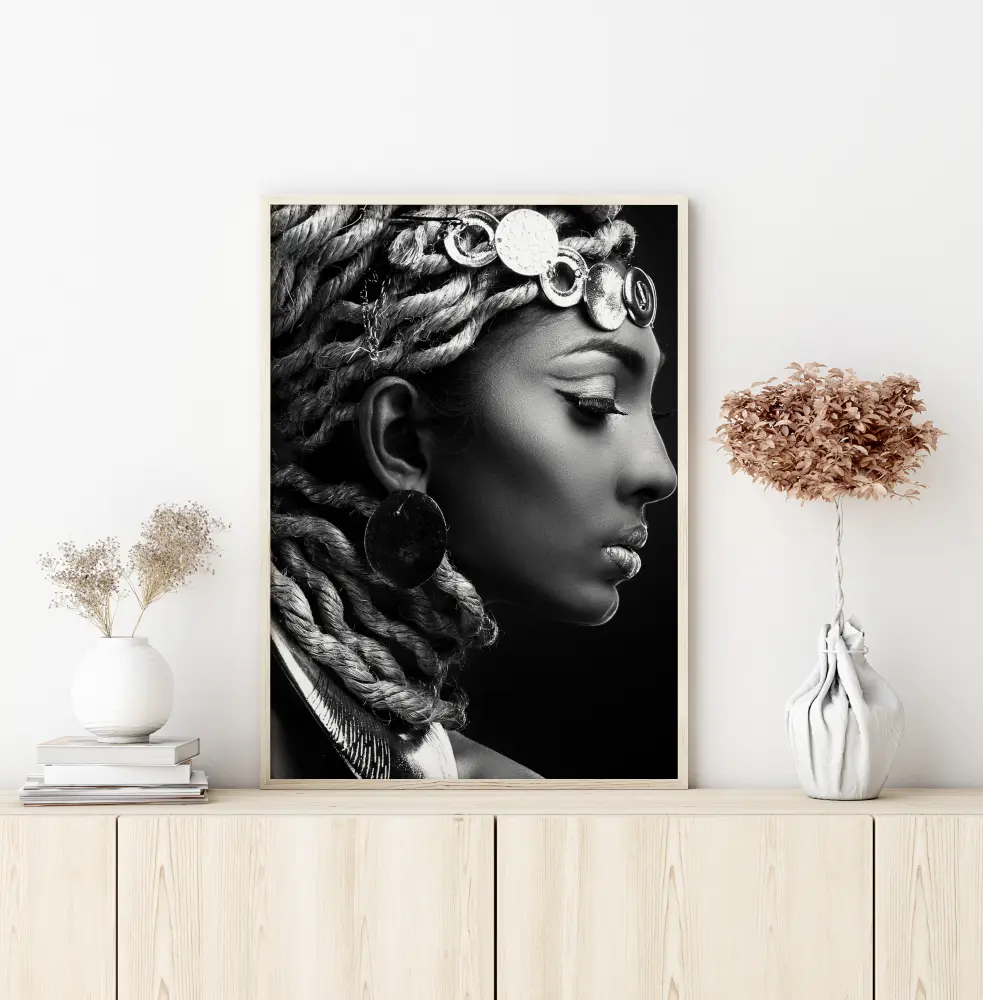 Egy fantasztikus portréposzter egy női profilról, ahol ókori egyiptomi stílusban van öltözve. Ez a fekete-fehér kép drámai hatást kelt, mivel ez a gyönyörű nő arrogánsan néz lefelé. Feje, fülei és nyaka nagy arany ékszerekkel vannak borítva, ami a gazdagság szimbóluma. Mindennap inspirálódj ettől az erős nőtől.