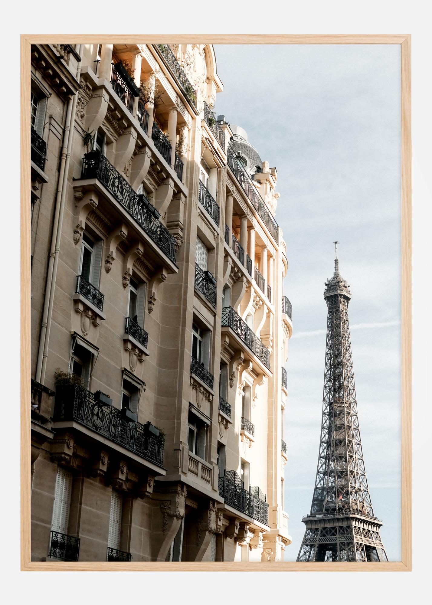 Ez a poszter Párizs klasszikus látképét ábrázolja, ahol az Eiffel-torony büszkén emelkedik a város tipikus lakóházai mögött kovácsoltvas erkélyeikkel és szoborszerű homlokzati részleteikkel. Ez egy olyan jelenet, amely párizsi hangulatot és eleganciát sugároz, tökéletesen alkalmas arra, hogy egy csipetnyi francia varázst adjon bármelyik otthonhoz. A kép megörökíti a város építészeti gyöngyszemei és a nyitott égbolt közötti tökéletes egyensúlyt, ami a tér és a szabadság érzését nyújtja, amely Párizs lelkével azonos.