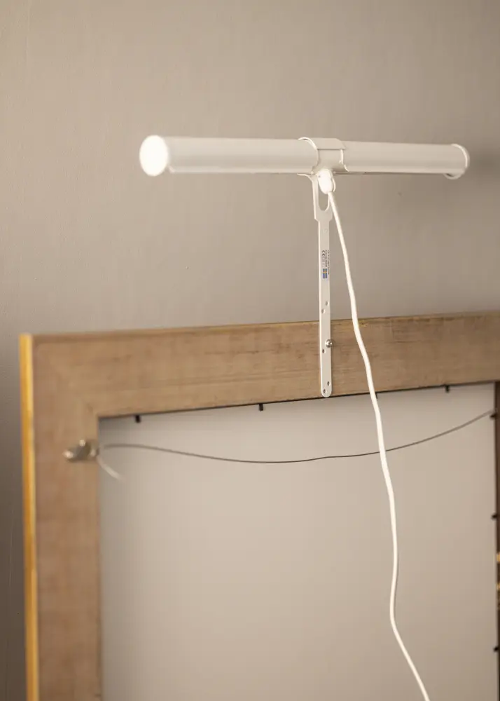 Normális esetben a képmegvilágítást a keret hátoldalára rögzíted, ennek hátránya, hogy fa keret szükséges (néhány kompozit keret is megfelelő), amelynek széles profilja van ahhoz, hogy a keretbe lehessen csavarozni. Azzal a fali rögzítőnkkel ezeket a kérdéseket könnyedén elkerülheted, mivel egyszerűen a kép mögötti falra szerelheted a képmegvilágítást.