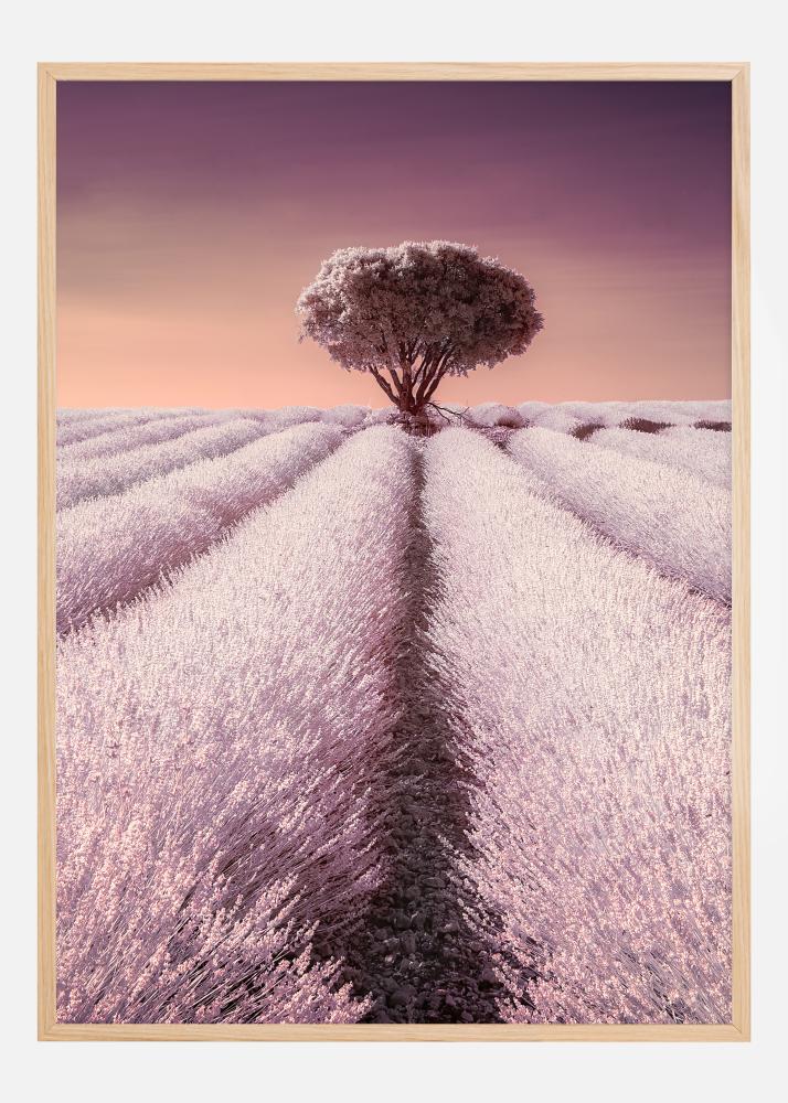 Lépjen be a színek és a fantázia álomvilágába exkluzív poszterünkkel. Ez a nyomat varázslatos érzést áraszt pasztellszínű égboltjával, amely a meleg rózsaszíntől a nyugtató lila árnyalatokig terjed. A motívum egy magányos fát emel ki, amely fenségesen középre helyezkedik el a levendulamező sétányának tiszta vonalán. Ez a poszter vizuális ünnep a szemnek, és tökéletesen illene bármely szoba központi képéhez, és nyugalmat és szépséget visz a térbe.
