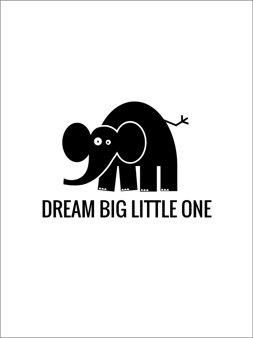Modern fekete-fehér poszter gyerekszobába egy mókás elefánttal, amely arra biztatja a kicsit, hogy nagyot álmodjon az életben. A motívum grafikus és letisztult, így minden gyerekszobába illik. A poszter jól mutat egyedüli képként az ágy felett, vagy több nyomattal együtt egy hosszabb falon, és előnyösen kombinálható a Dino Favorite, Kanin Happy, Hund Little, Superhero vagy Pingvin Cool poszterekkel.
