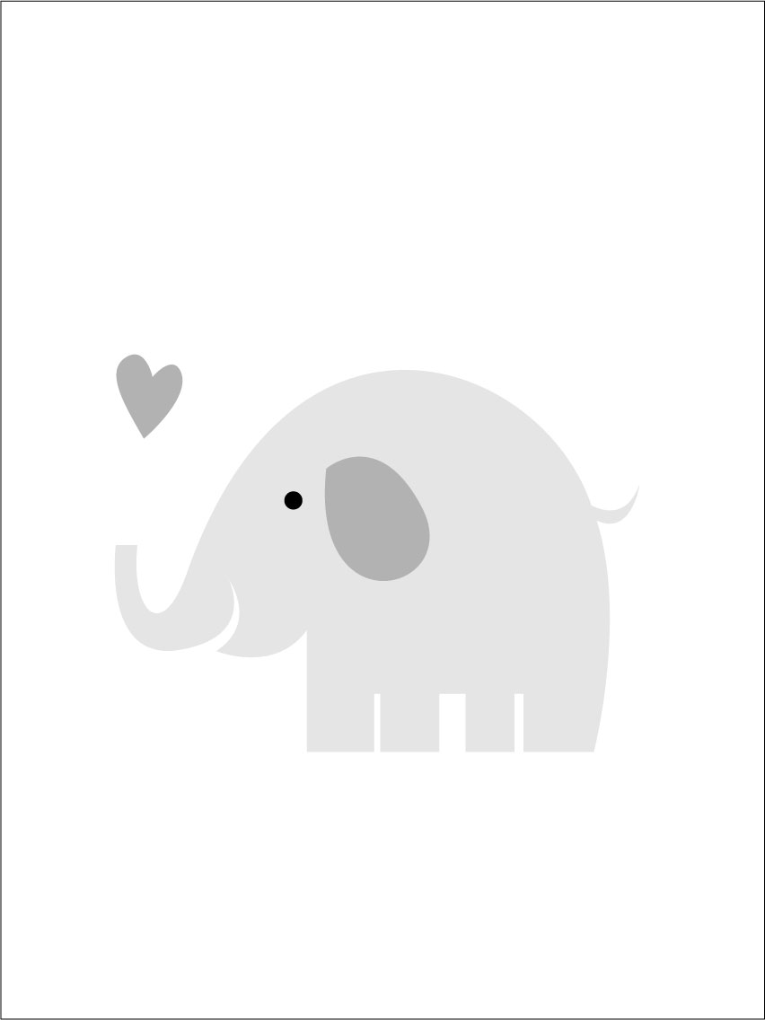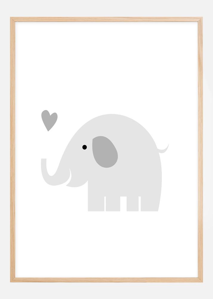 Plakát grafikus nyomtatással egy aranyos elefántról és egy szívről ködszürke árnyalatban fehér háttérrel. Valami azoknak, akik szeretik a szavanna minden állatát, de talán elsősorban a fiatalabb gyerekek szobájába illik. A poszter kombinálható más állatos vagy elefántos poszterekkel ugyanolyan színösszeállításban, hogy egy varázslatos mesebeli érzést teremtsen a gyerekszobában.