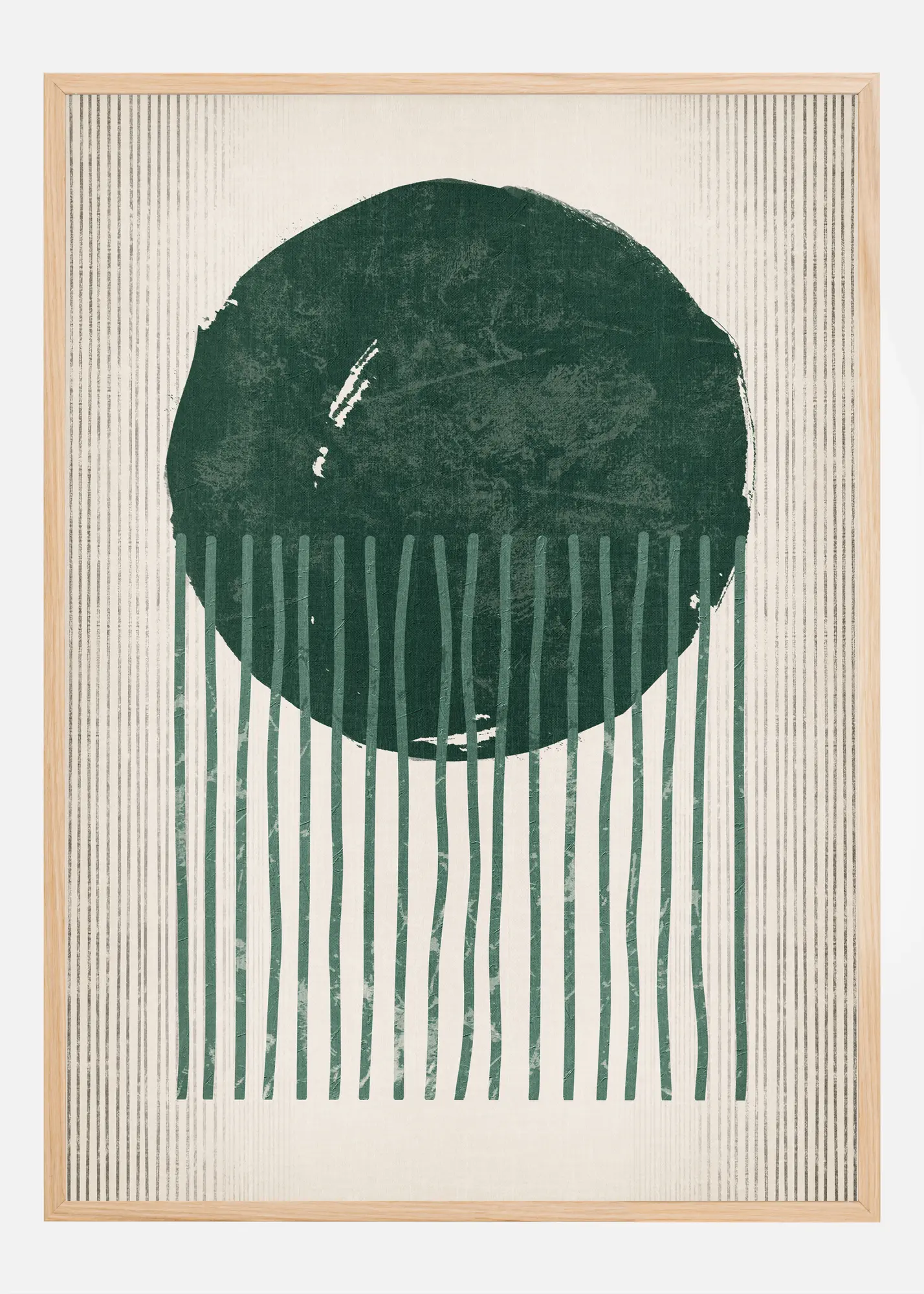 Ez a poszter egy képzeletbeli felfedezésre hív a tengeri világban, egy stilizált képpel, amely egy medúzára emlékeztet fodrozódó csápjaival. A smaragdzöld erős kör alakú forma egyszerre lenyűgöző és megnyugtató, míg a fehérre festett, függőleges vonalak, amelyek a 'csápokat' alkotják, mozgásérzetet keltenek. Ez egy művészi értelmezés, amely ötvözi az absztrakt formát a biológiai fantáziával, és egy egyedülálló, modern fordulatot ad a tengeri témának.