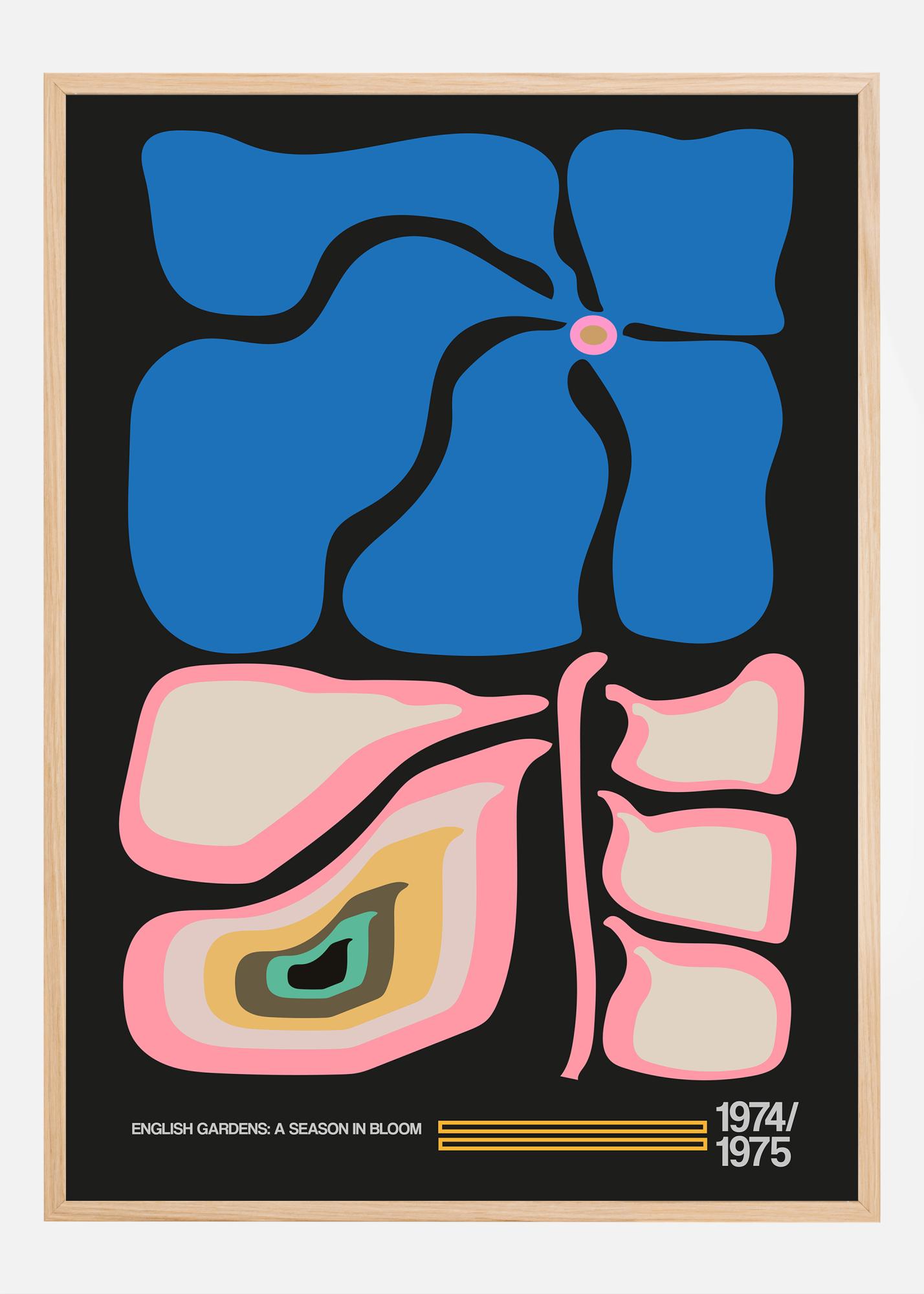 Ez a kreatív és színes 'English Gardens: A Season in Bloom' poszter a kertek virágzásának sokféleségére és pompájára esztétikus tisztelgés. A posztert lenyűgözi a szemet erős, kék virágával, amely kontrasztot képez a fekete háttérrel, kiegészítve rózsaszín, bézs és egy csipetnyi zöld árnyalatokkal. Ez a különleges színkombináció merész és modern értelmezést kínál egy klasszikus angol kert teljes virágzásának. Az '1974/1975' évszám történelmi dimenziót ad hozzá, amely esetleg egy jelentős időszakra utal a kertek vagy a művészet szempontjából.