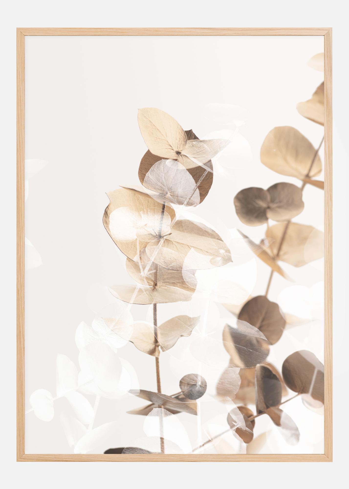 Egy aranyozott poszter eukaliptuszlevelekkel és ágakkal. Az arany színű és barna levelek ragyogó formában tűnnek ki az egyszerű fehér háttér előtt. Hogy fokozza ezeket a leveleket, párosítsa hasonló arany- vagy sötét krémszínű falhoz a fokozott elegancia érdekében.