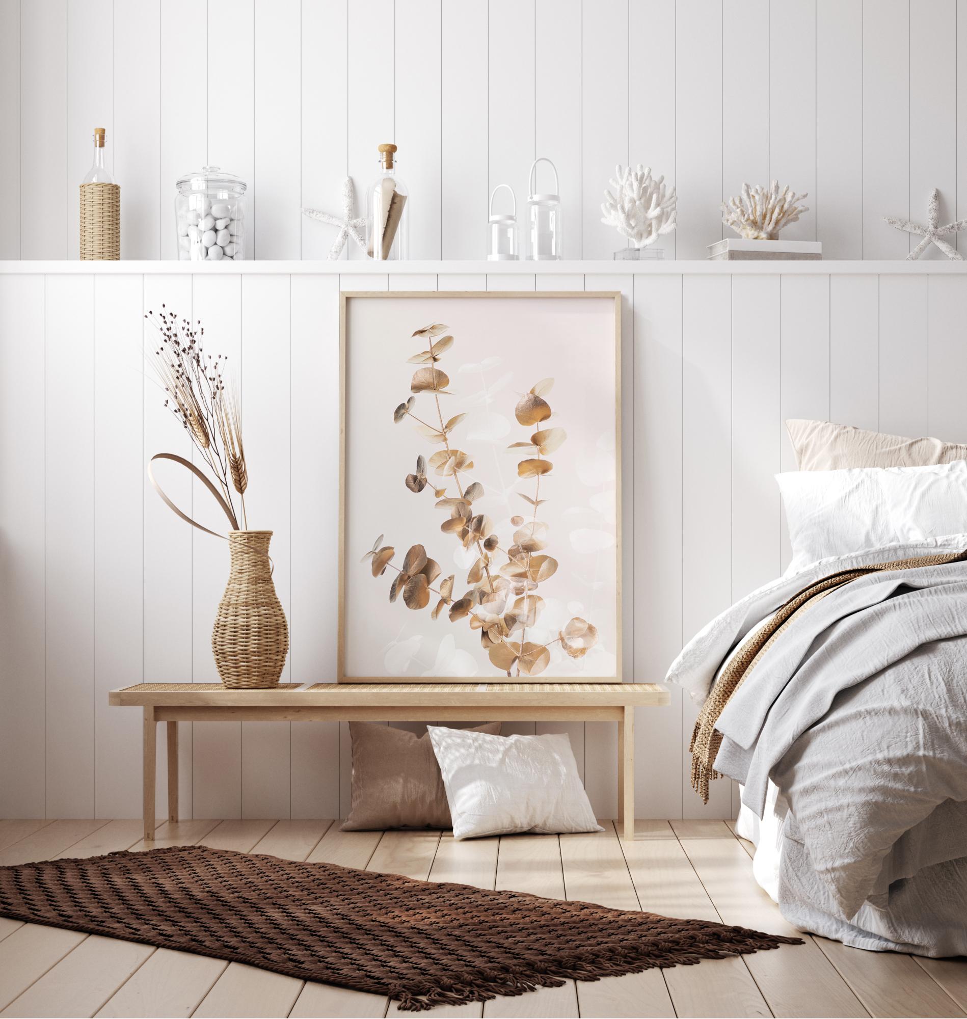 Egy csodálatos poszter arany színű eukaliptusz ágakkal. Az arany és barna levelek puhák, ahogy kiemelkednek a fehér háttérből. A levelek kerekek, ami szép formákat hoz létre a képen. Ez a poszter nyugodt és elegáns érzést kölcsönöz otthonának.