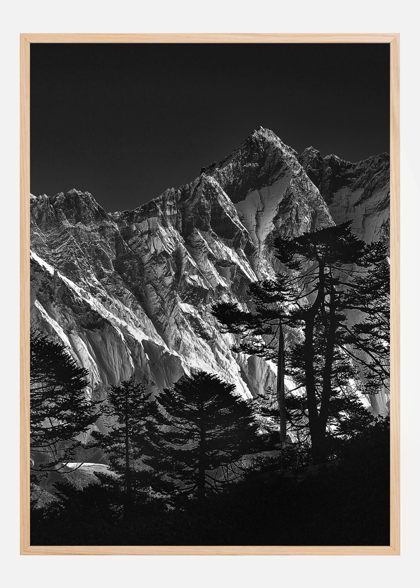 Egy hegyposter, amely a Mount Everest egyik oldalát mutatja. Ez a drámai fekete-fehér fotó éles fényben mutatja a hegy tiszta oldalait. Sötét fák vannak az előtérben, és a hegyet egy sötét ég veszi körül. Érezze a drámát és a veszélyt ebben a képben.