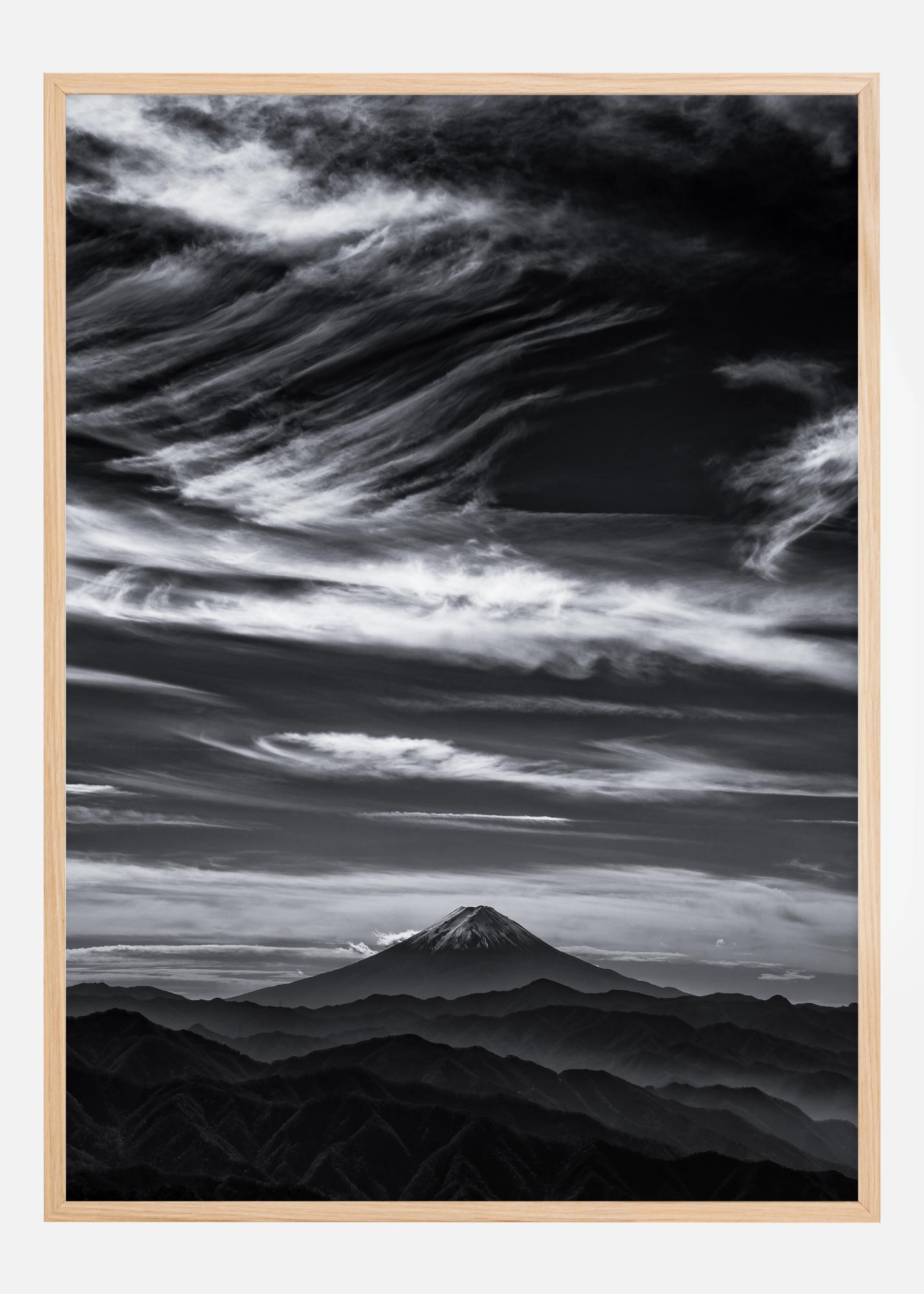 Ez a poszter a Fuji ikonikus hegyének nagyszerű fekete-fehér ábrázolása, amelyet az ég felett lévő felhők és szelek drámai játéka ölel körbe. A sötét, bordázott hegyláncok és a lágy égbolt közötti kontraszt erőteljes és dinamikus vizuális benyomást kelt, amely egyszerre időtlen és elbűvölő.