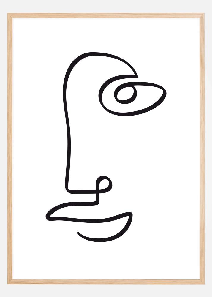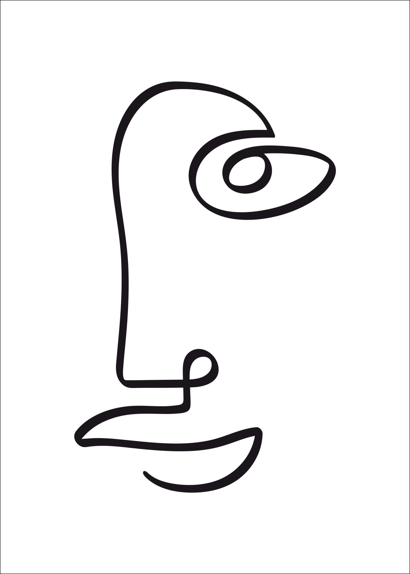 Absztrakt poszter, amelyen egy arc látható, fekete vonallal rajzolva. Az egyszerű fekete vonal a képen kanyarog, hogy megalkossa az arc egyik oldalát anélkül, hogy egyszer is elhagyná a papírt. Figyeld meg ezt az egyszerű képet, amikor otthon kiteszed, és próbálj meg más alakokat látni, amelyek rejtve vannak a műben.