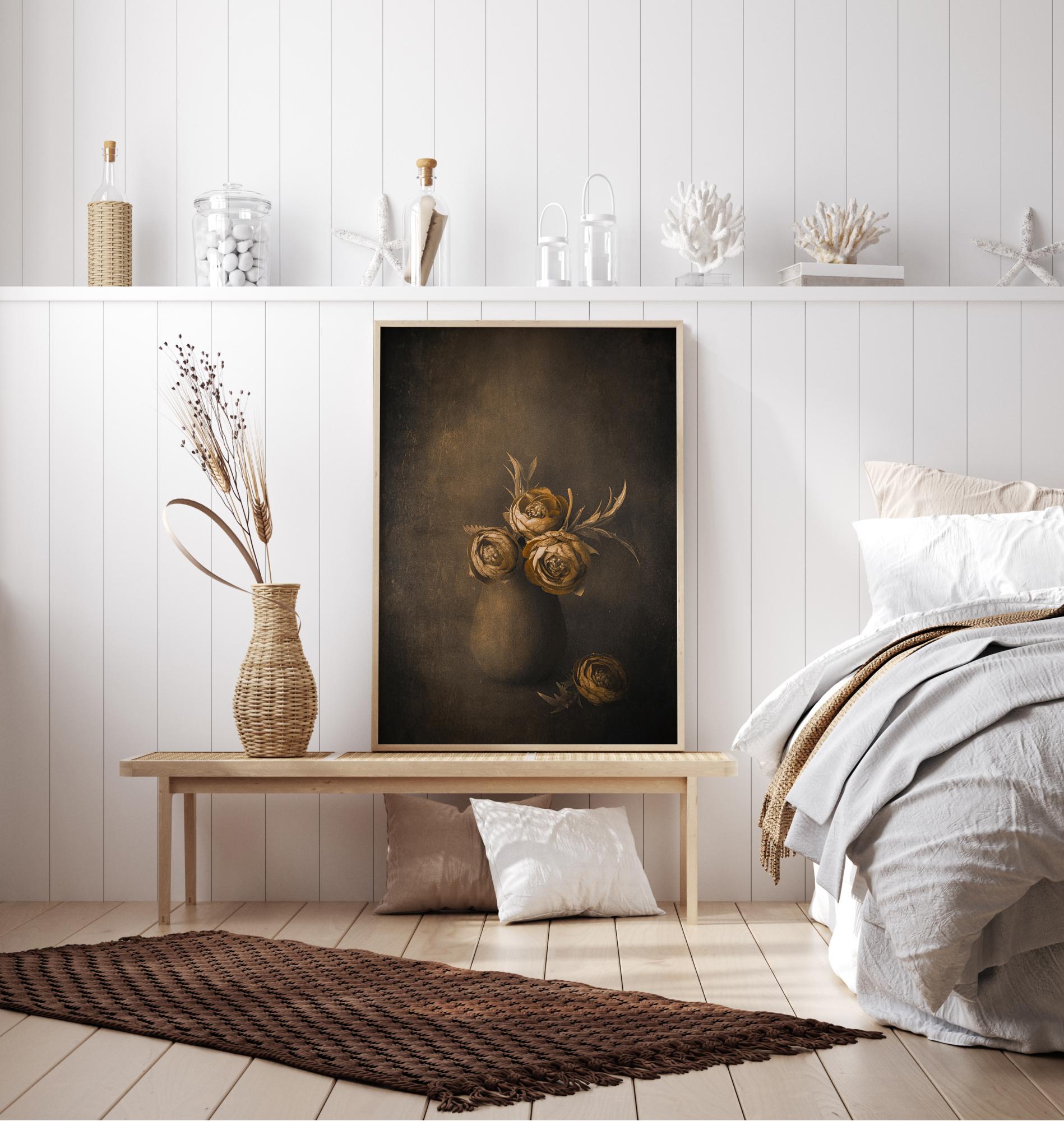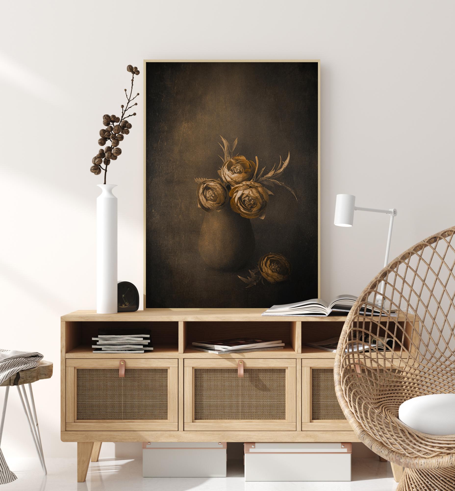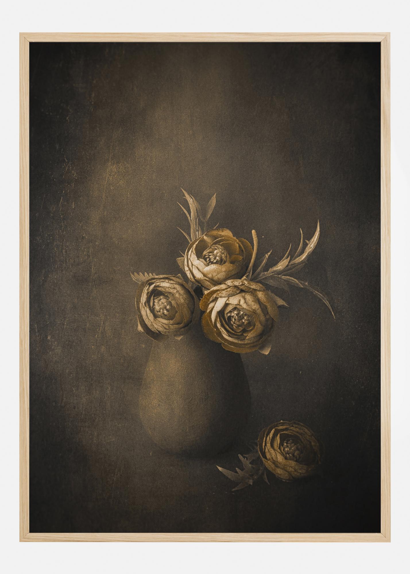 Egy csendéletposzter arany virágokkal egy agyagkorsóban, sötét háttér előtt. A csillogó aranysárga virágok kitűnnek a festmény sötétebb barna falával szemben. Párosítsd ezt egy krémszínű fallal, hogy a virágokat új szintre emeld.