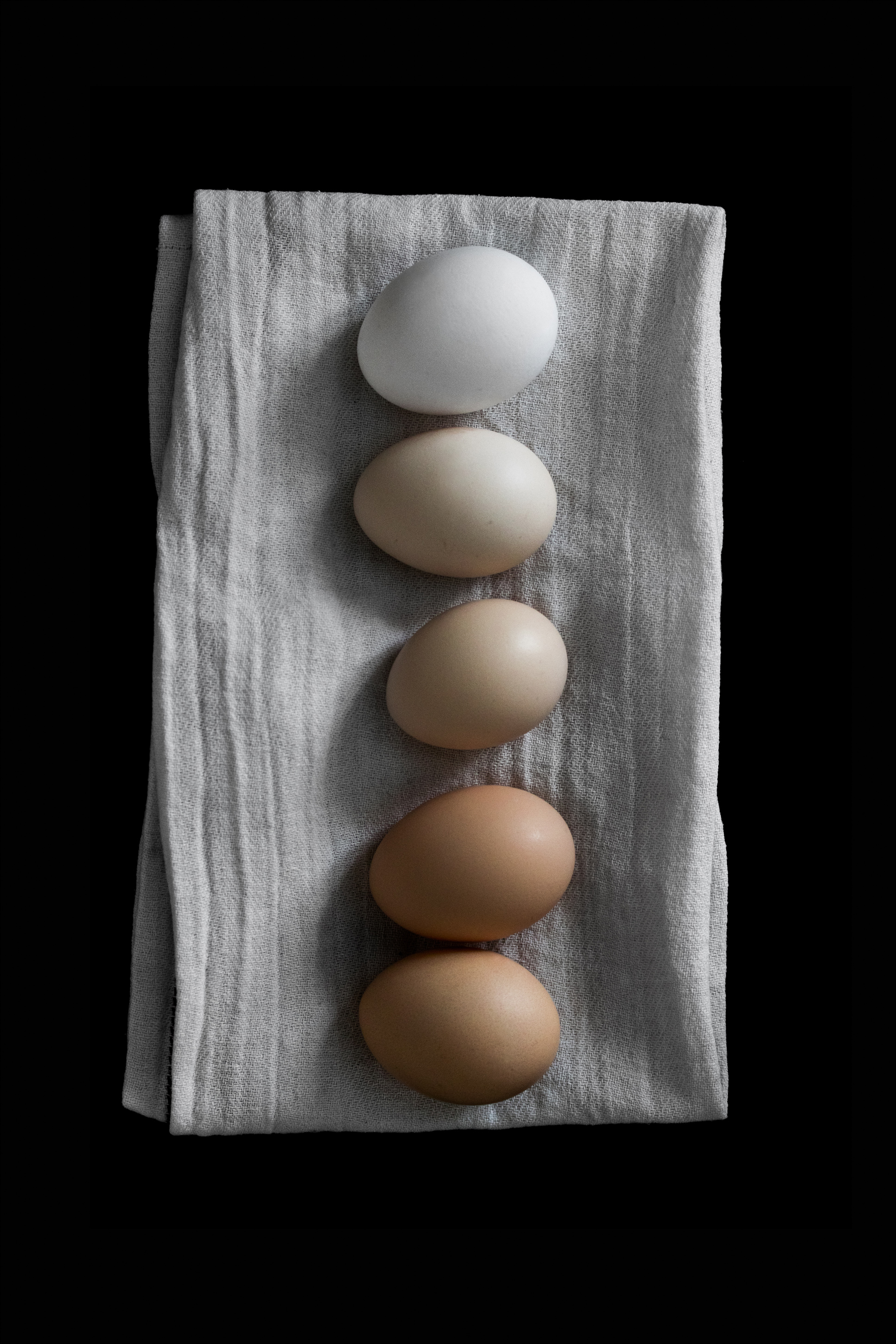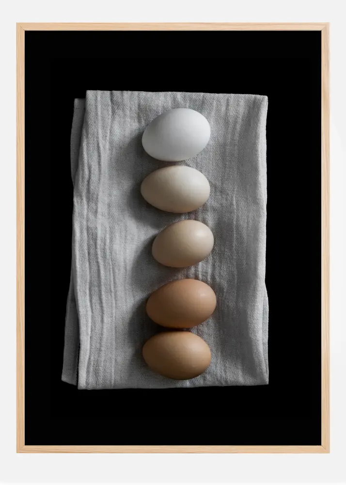 Egy aranyos, rusztikus poszter öt tojással, amelyek sorban helyezkednek el egy fehér konyharuhán. Minden tojás különböző színű, a fehérrel kezdve a tetején, és a különféle árnyalatokon keresztül a barnáig a legalján. Vidám, mókás főzési hangulatért akaszd fel ezt a konyhai faladra.