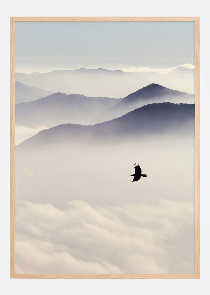 Ez a természet ihlette poszter az egyszerű, mégis erőteljes szabadság és csend képét ragadja meg. Egy magányos madár repül fenségesen egy ködös völgy fölött, miközben a hegyek rétegei fokozatosan eltűnnek a hajnal vagy alkonyat lágy fényében. A lágy tónusok és a minimalista táj nyugalom és határtalan szabadság érzését nyújtják.