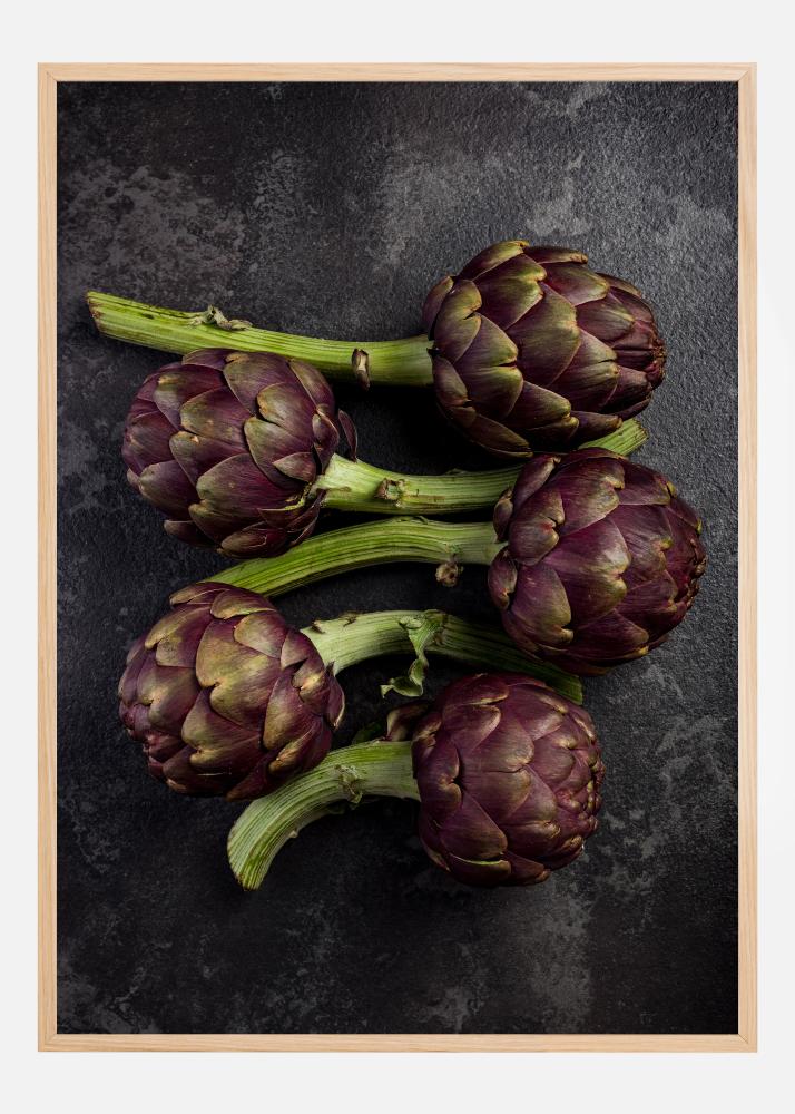 Ez a rusztikus és természet ihlette poszter öt árnyalatokban gazdag articsókát ábrázol sötét, texturált háttér előtt. A közeli fotó kiemeli az articsókák leveleiben rejlő mélyzöld és bíborvörös árnyalatokat, és a földközeli motívum jól illene egy konyhába vagy étkezőbe, ahol kulináris kalandokra inspirálhat. Ez a nyomat nemcsak a természet szépségének tiszteletadása, hanem emlékeztető is a friss ételek azon képességére, hogy összehozzák az embereket.